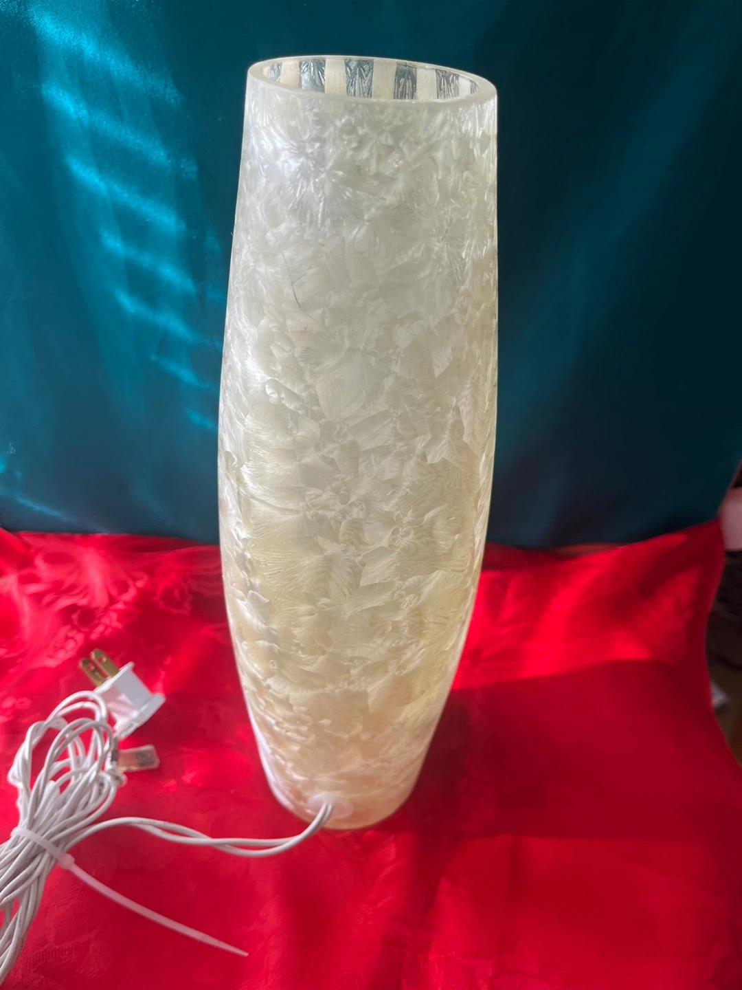 This beautiful vintage-look vase lamp features a lovely birch tree winter theme with deer and hand painted cardinals, designs by Barb Tourtillotte. It measures approximately 11 inches in height and 3 inches across the bottom.