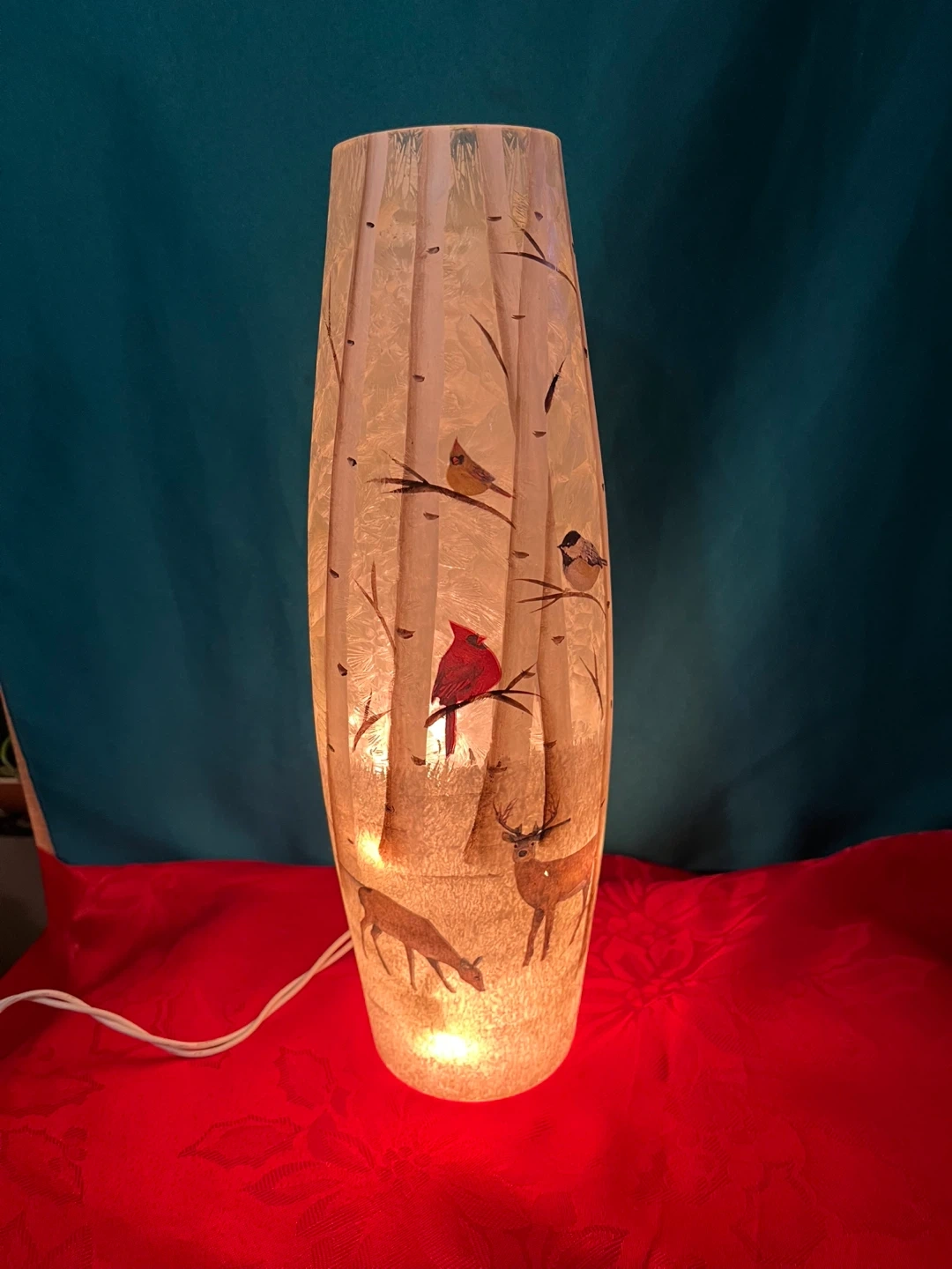 Retro Birch Tree Themed Vase Lamp with Cardinals & Deer