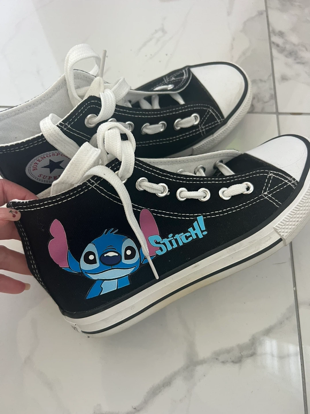 Selling a pair of All Star Sport high-top sneakers featuring a cute 'Stitch' design! They're black and white and in great condition. The size is 35.