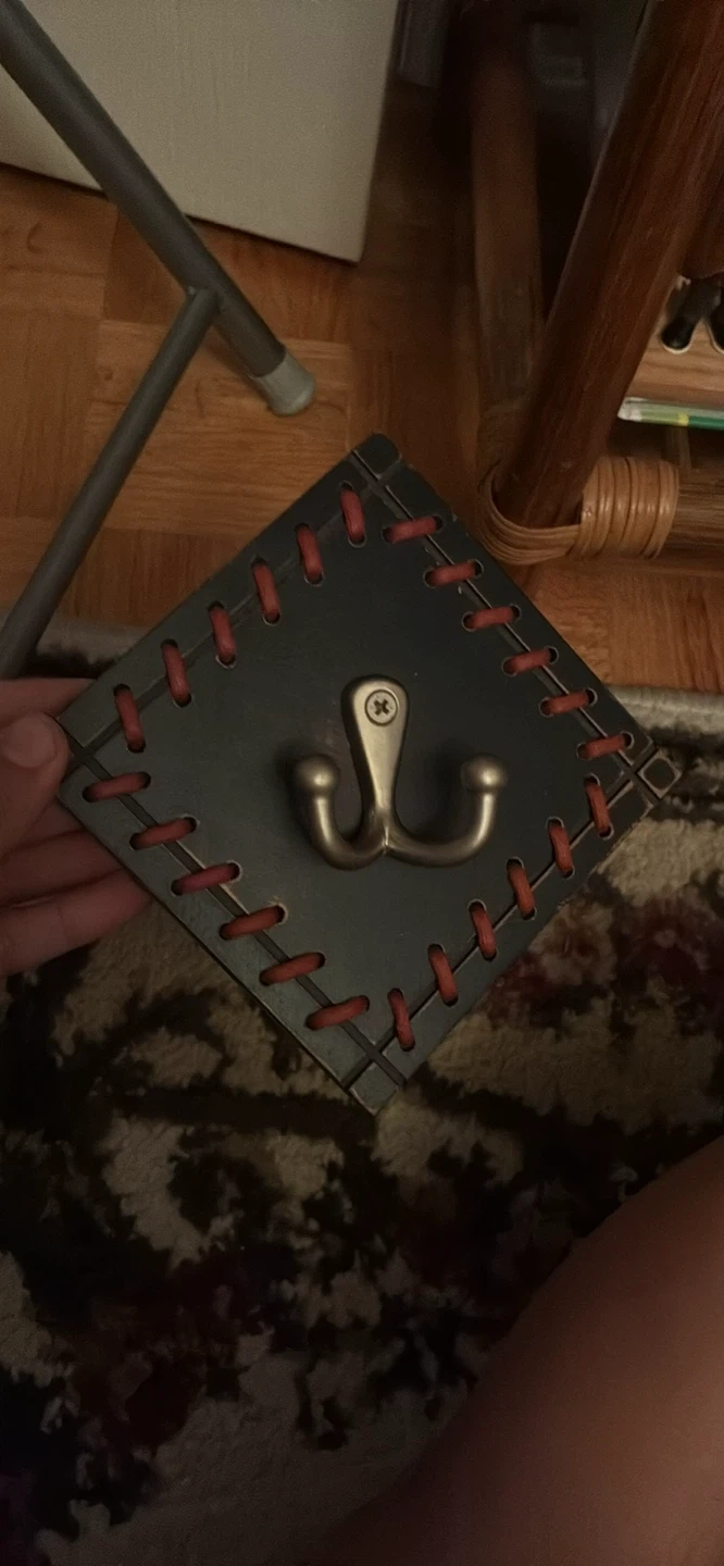 This is a decorative metal wall hook. It has a square shape with red stitching around the edges and a double hook in the center. It would look great in an entryway or bedroom