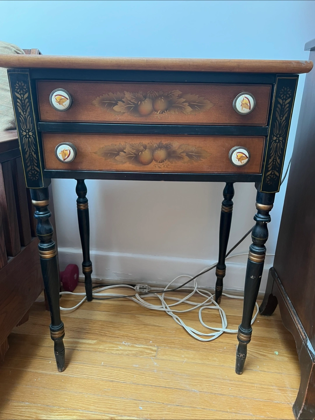 Selling a cute wood side table! It has two drawers and decorative details on the sides and drawer fronts. Great for a bedroom or living room Length : 21 inches depth : 16 height: 29