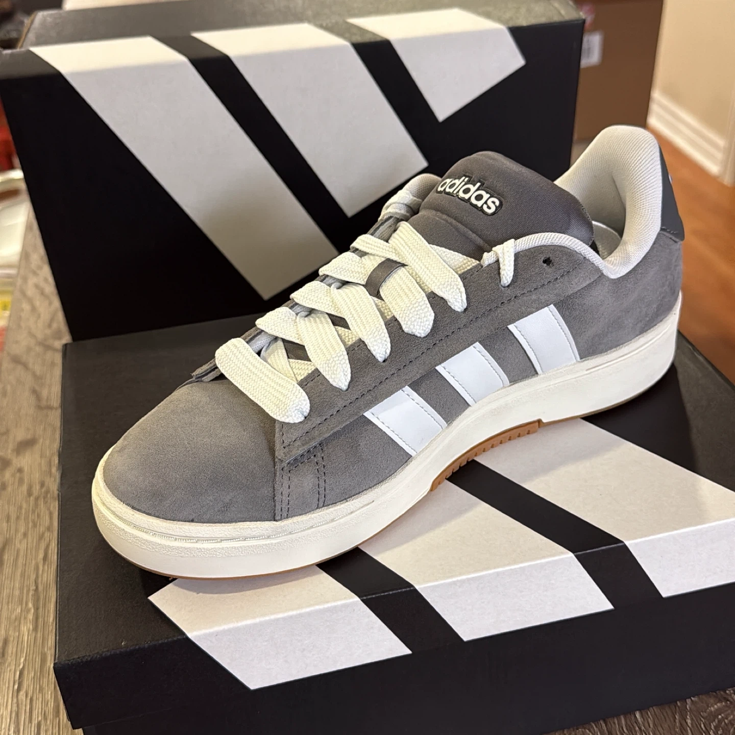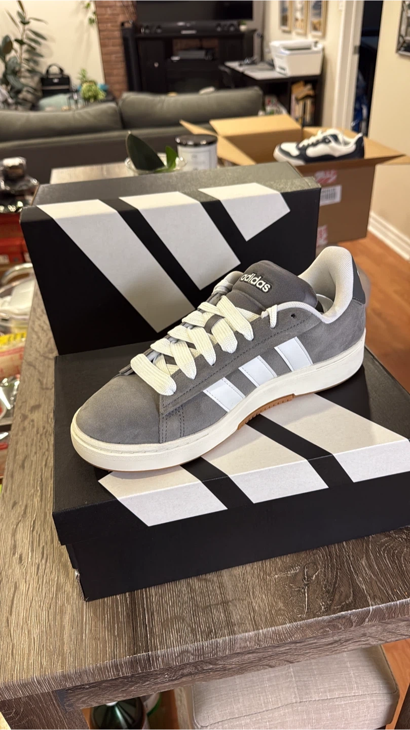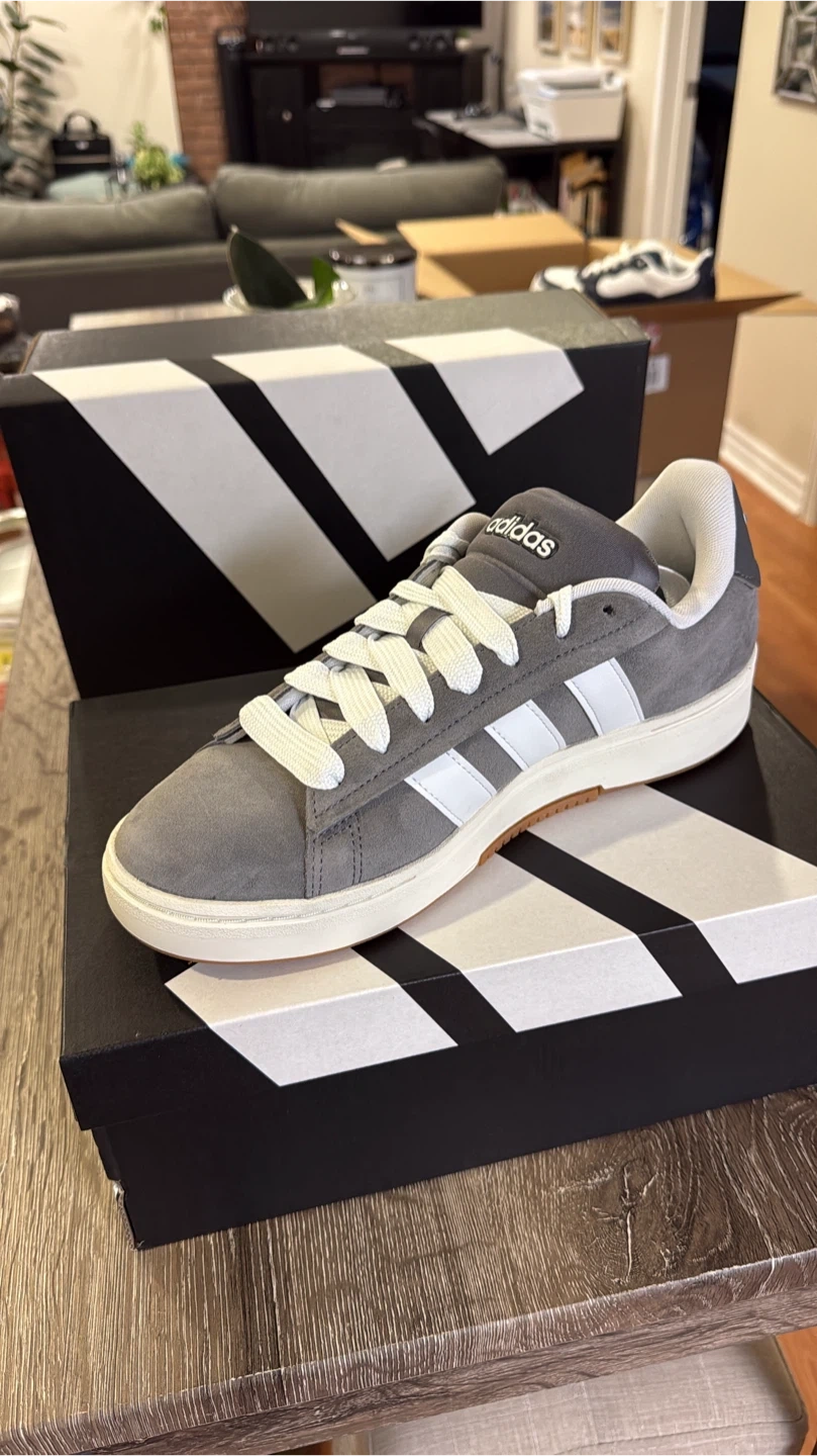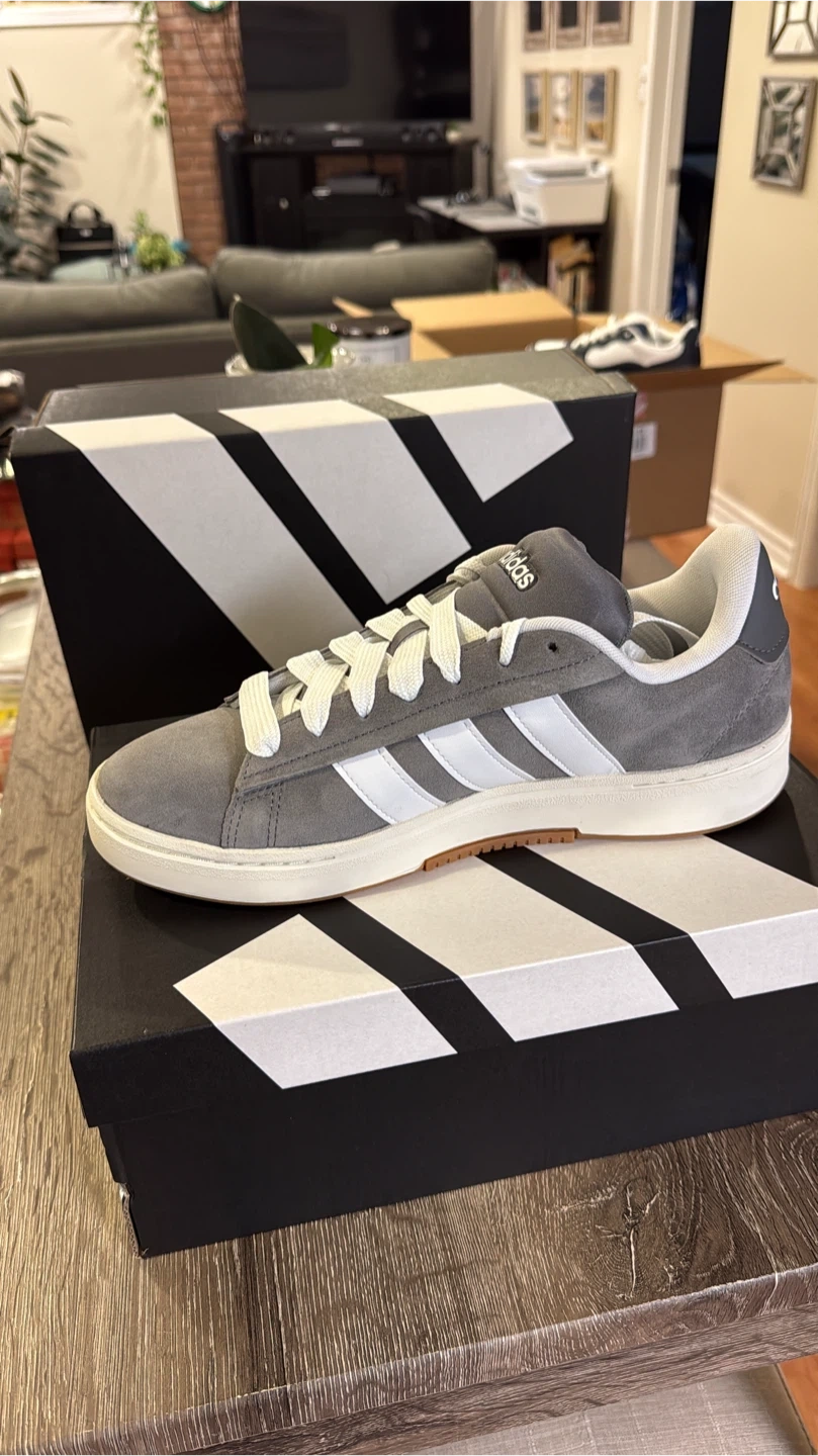 30Selling a pair of Adidas Grand Court sneakers in grey suede. These are in great condition and come with the original box. Perfect for everyday wear!
