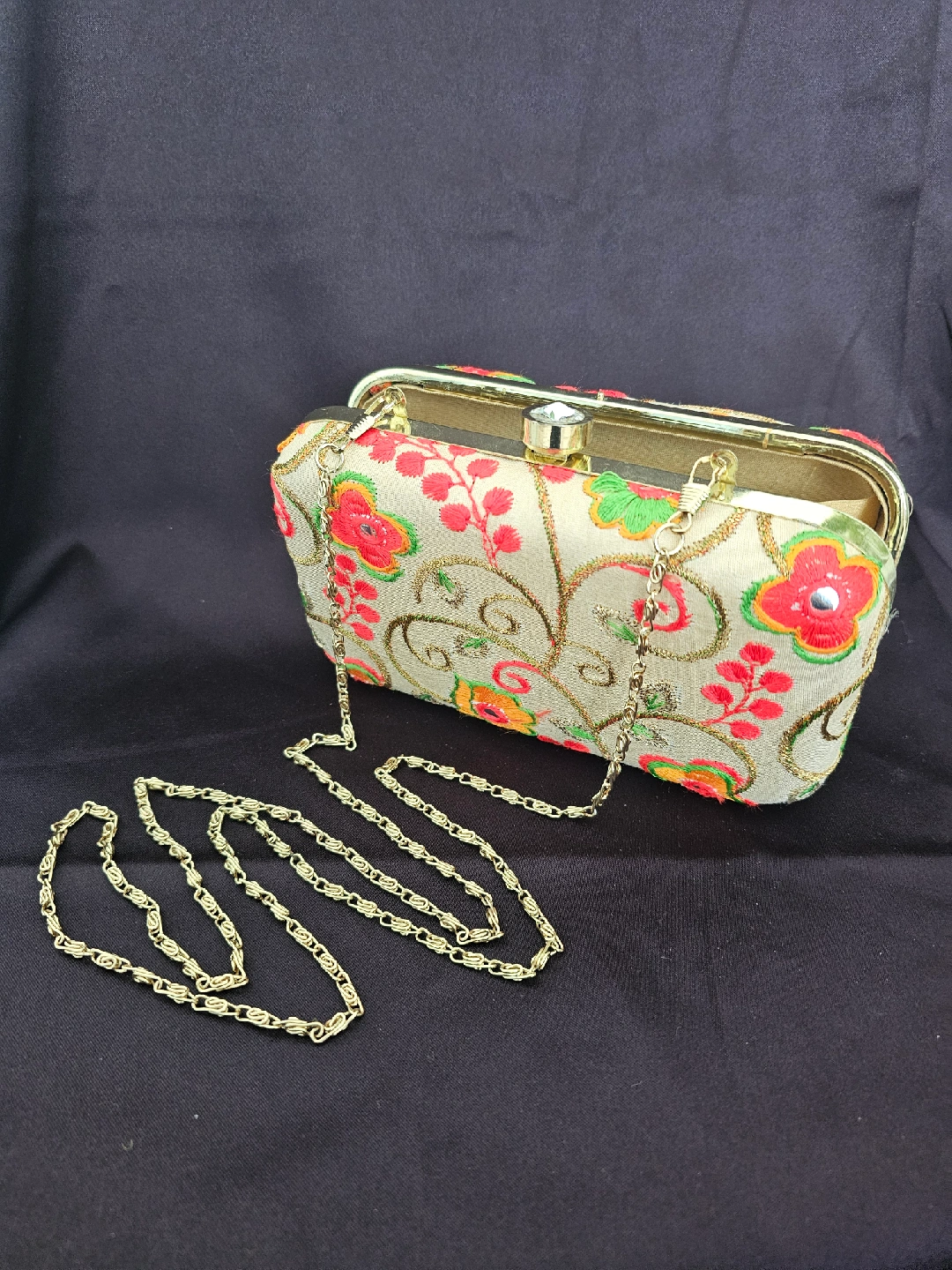 This is a beautiful floral embroidered clutch, perfect for an evening out or special occasion! It features a delicate chain strap and a secure clasp. The embroidery is colourful and eye-catching, adding a touch of elegance to any outfit. $20 Open to offers Pick up only Cash only near WESTON GO/UP train station south asian, desi, saree, indian, pakistani, bengali, wedding, purse, accessory