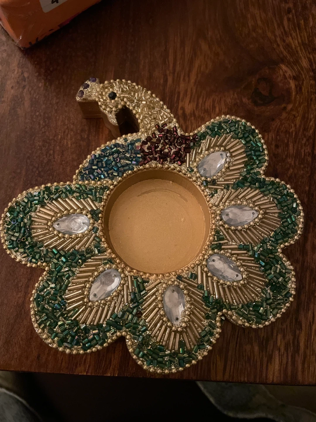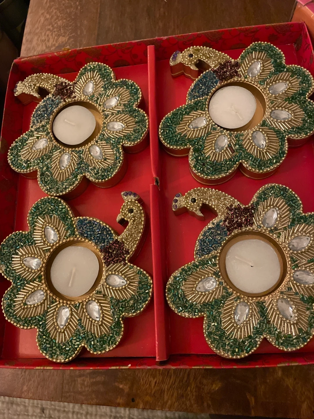 Add a touch of elegance to your space with these beautiful peacock flower tealight candle holders! This set of four features intricate beadwork and a unique design. Perfect for creating a warm and inviting atmosphere in any room