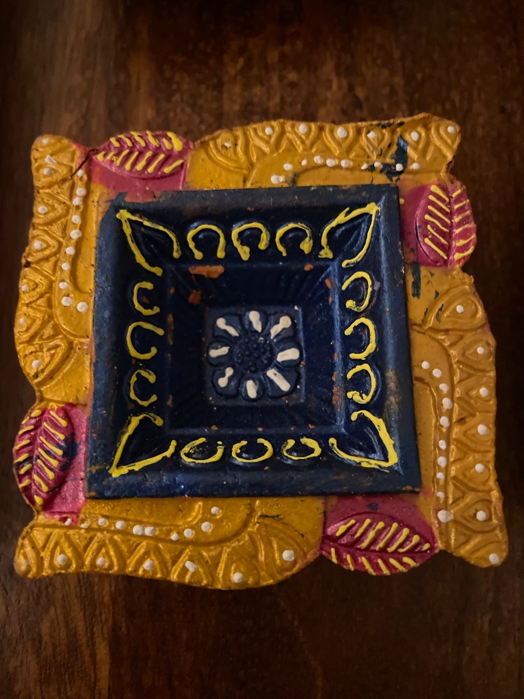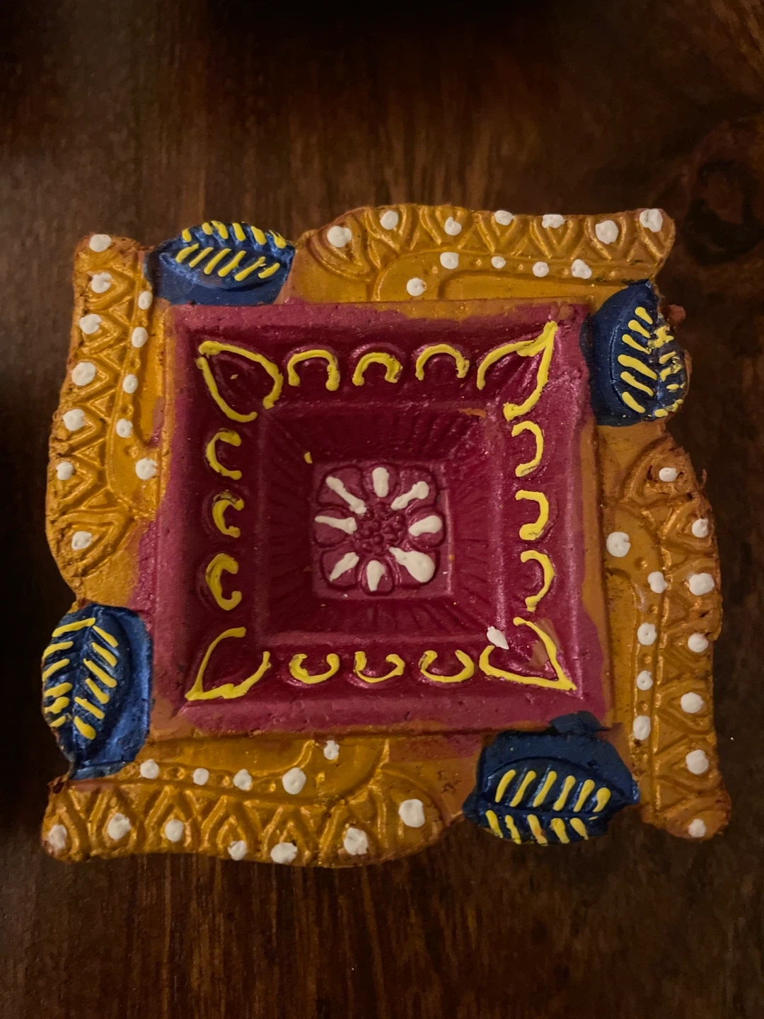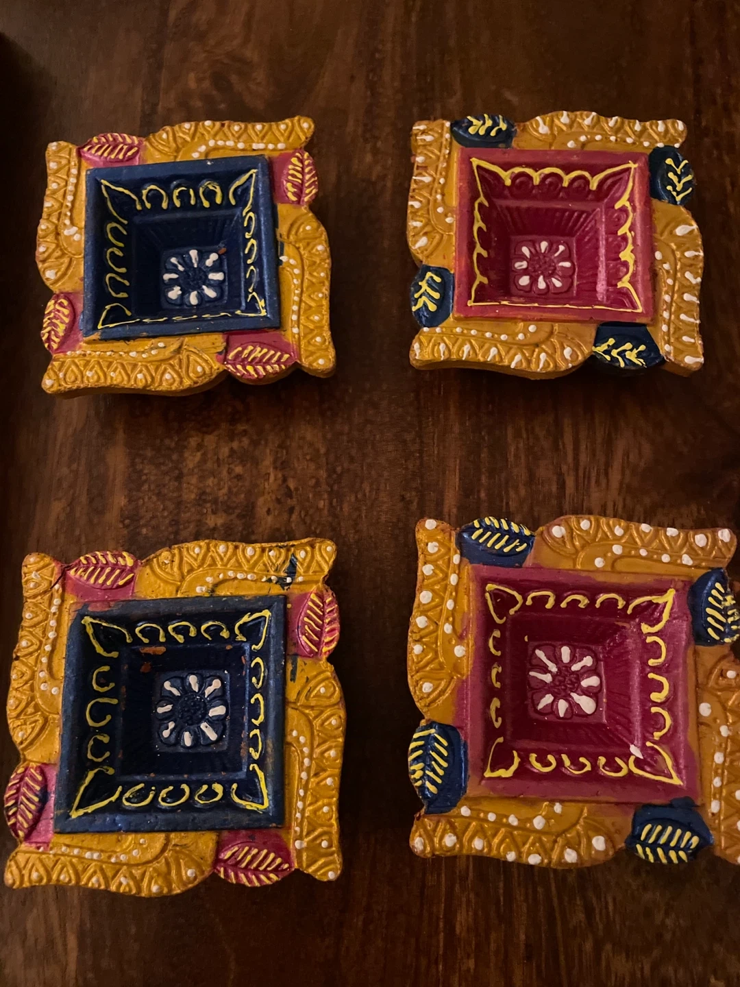 Selling a set of four decorative Diya oil lamps. These are perfect for adding a touch of cultural charm to your home decor. Two are blue and two are red. They are in good condition and ready to use