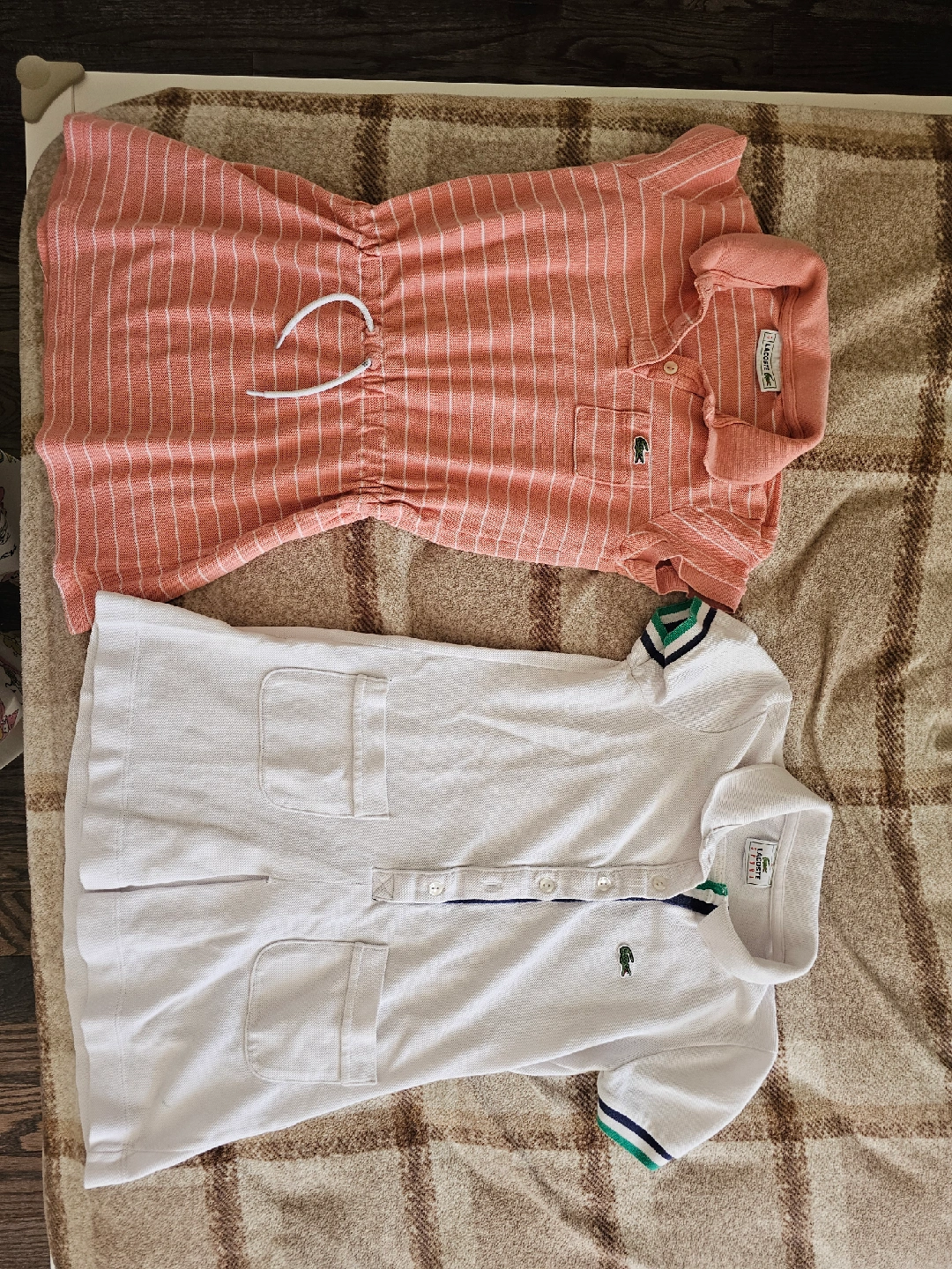 Selling two Lacoste dresses, both size 8 for $35. One is a salmon colour with white stripes and a drawstring waist. The other is white with sporty green and navy details. Both are in great condition!