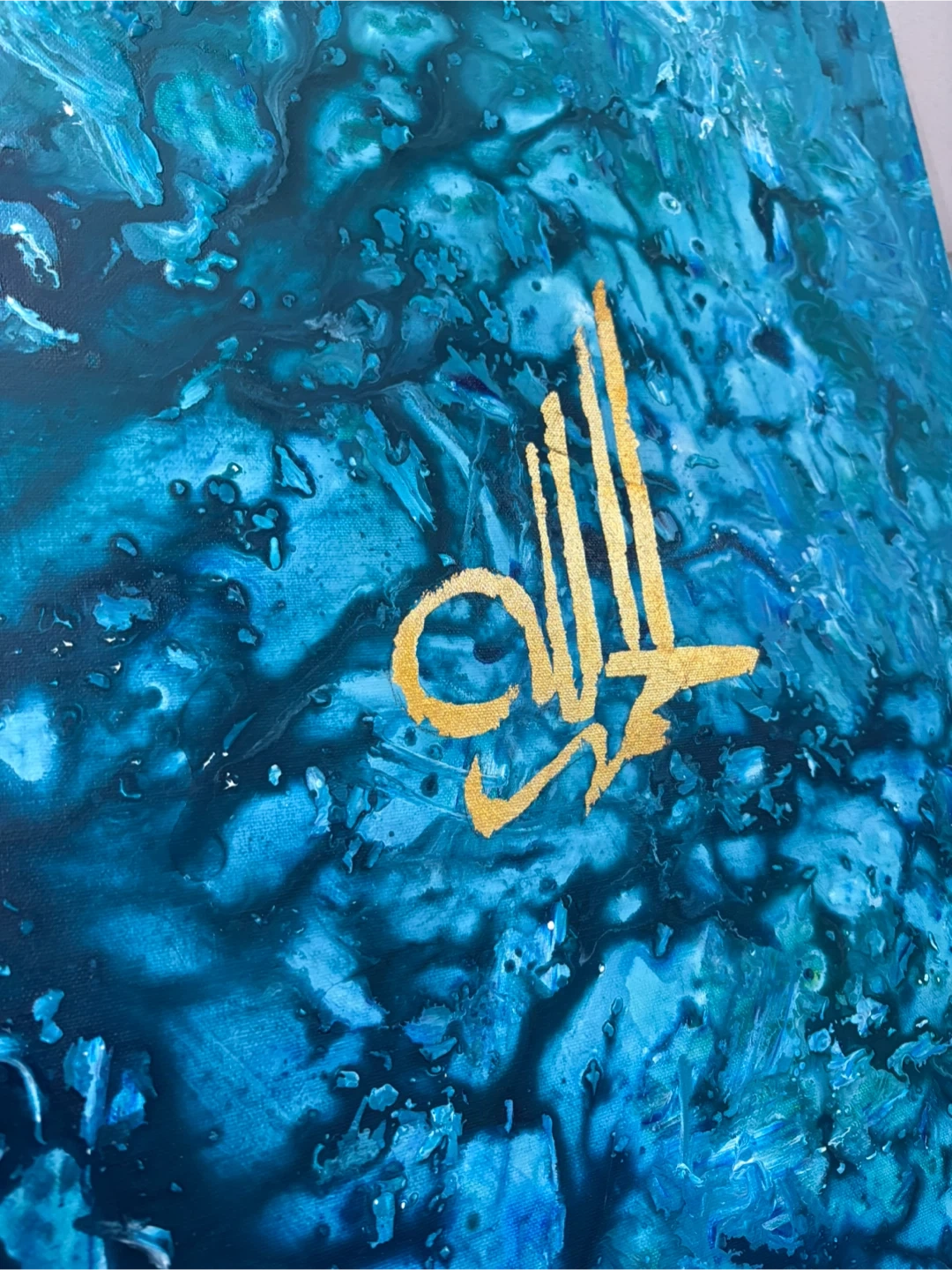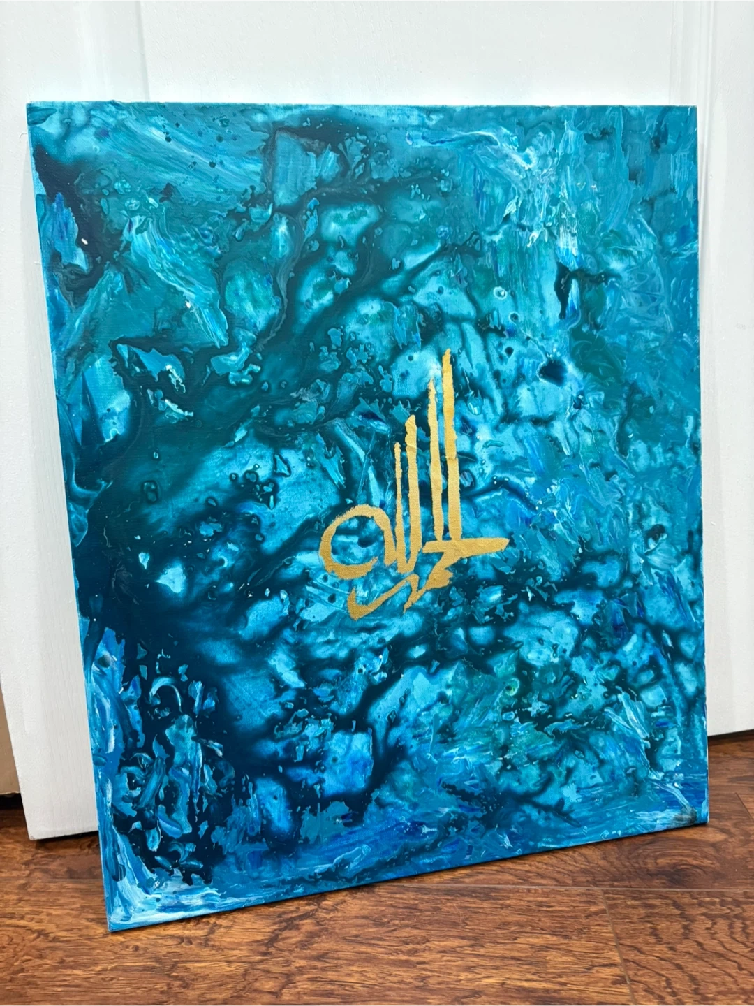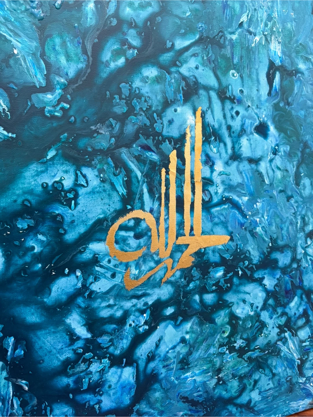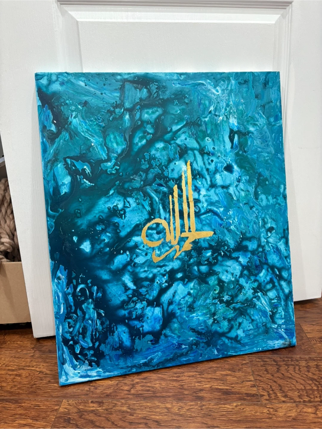 Beautiful abstract painting in shades of blue with a gold accent. It's a unique piece that would add a touch of artistry to any room Reads ‘Alhamdulillah’ and measures 20 x 23.5 inches