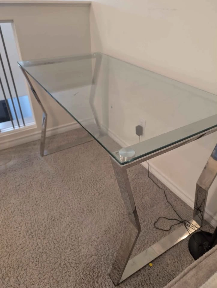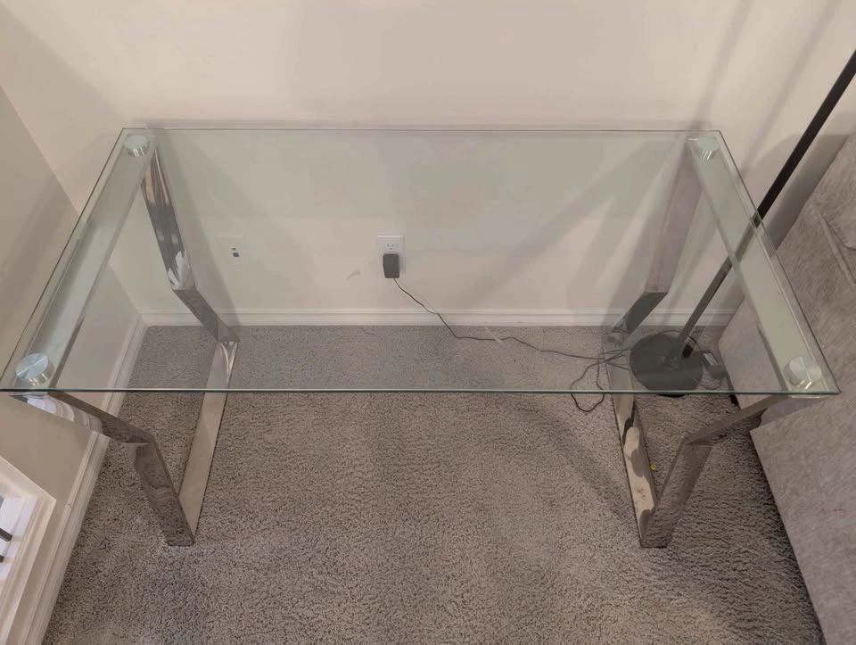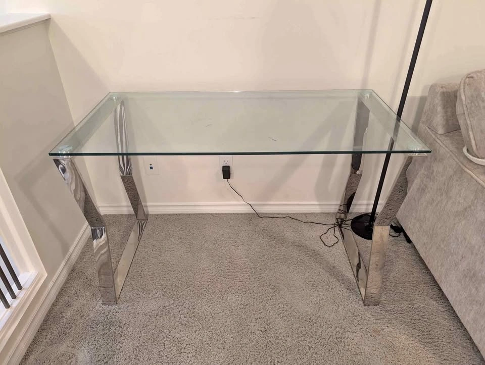 Sleek glass-top desk with polished chrome legs. Sturdy and stylish, perfect for a home office or workspace.