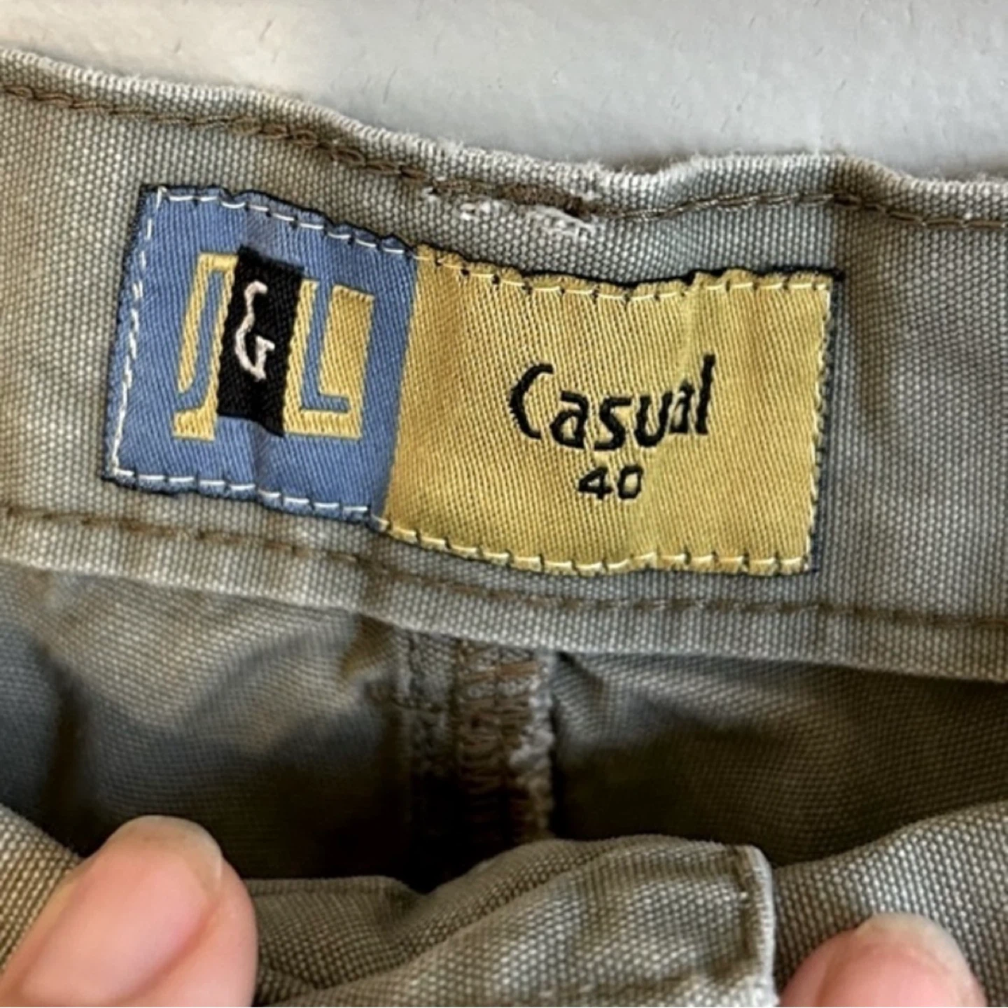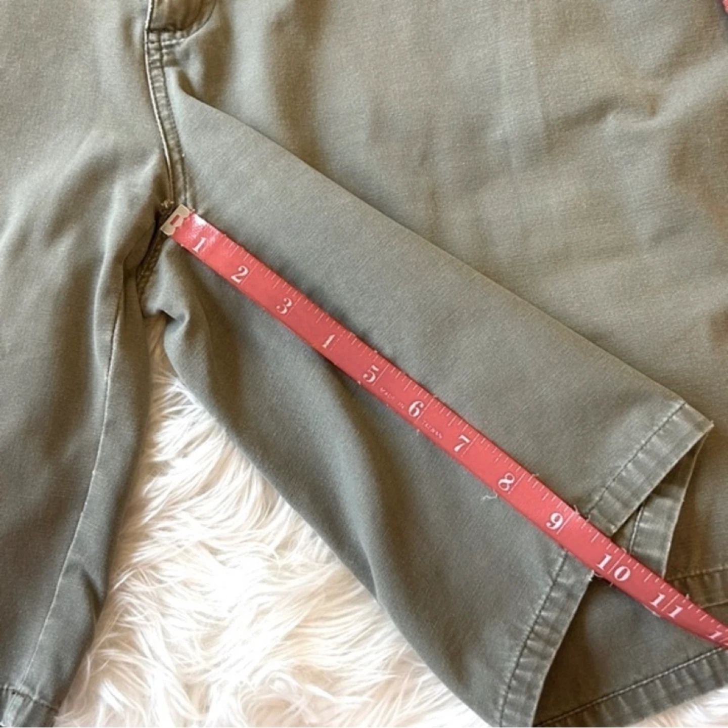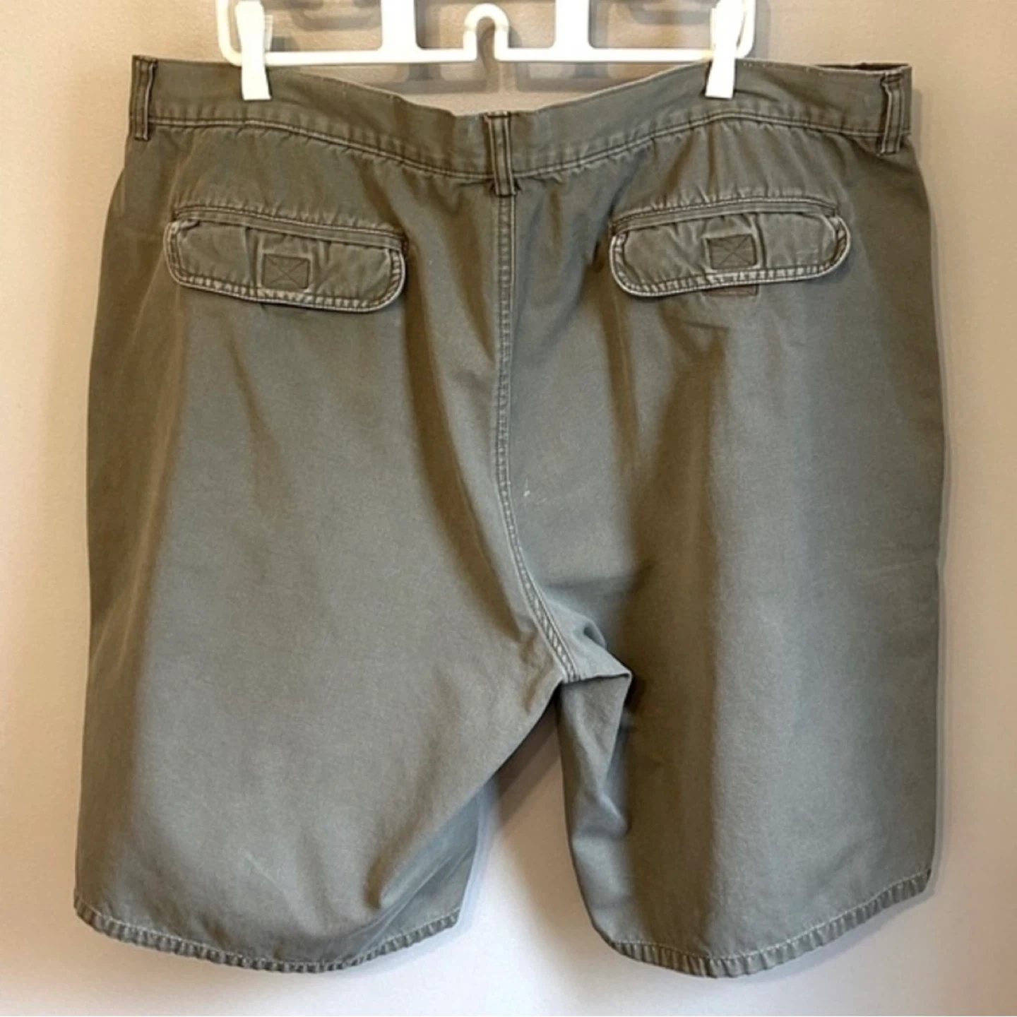Olive green flat front canvas shorts from J&L. A few small flaws (see photos) but overall in good condition. Slash front pockets and rear flap pockets. Button & zip fly. Men’s waist size 40. Cross posted.