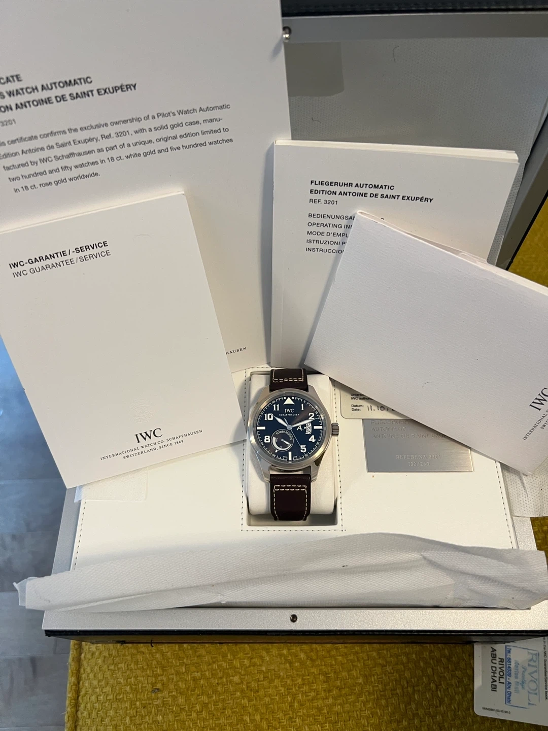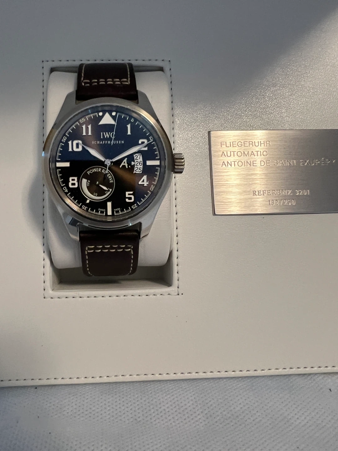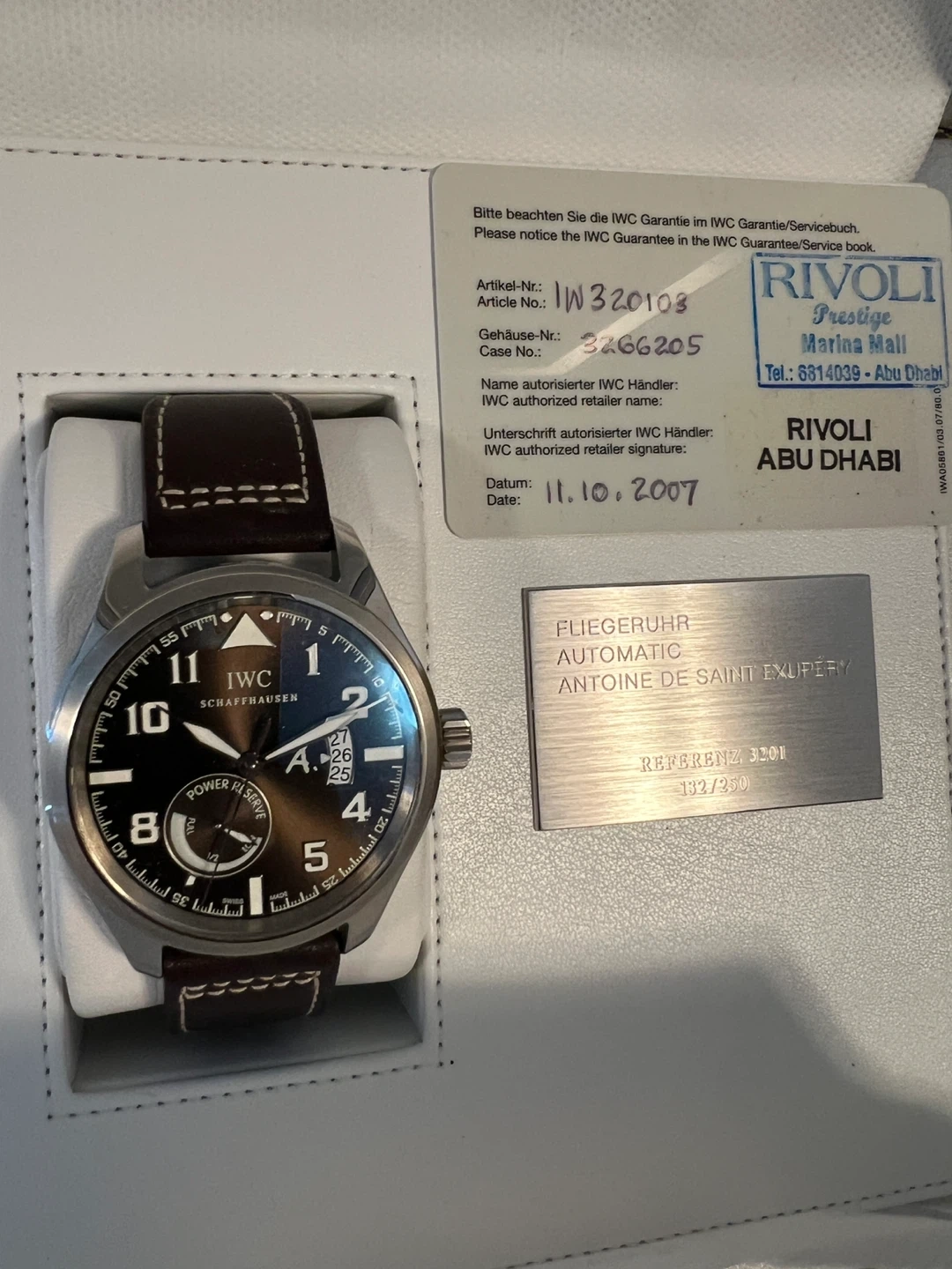 Brand new & Never Worn, IWC Automatic Edition Antoine de Saint Exupéry, reference 3201 in 18karat white gold. Limited to 250 pieces. This watch comes with its box and papers. Date of purchase is 2007 October 11.