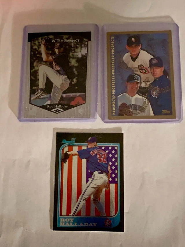Explore the world of sports memorabilia with this exclusive lot of 5 Roy Halladay rookie cards. A must-have for any baseball enthusiast, each card captures the early career of the renowned Blue Jays pitcher. These trading cards are a tribute to Halladay's impressive Major League Baseball journey and a cherished piece for collectors and fans alike. Delve into the details of each card, which showcases the player in his prime, and appreciate the craftsmanship that goes into sports trading cards. Ideal for expanding your collection or gifting to a dedicated MLB follower, these cards celebrate the legacy of one of baseball's iconic athletes. Feel free to message if you have any questions!