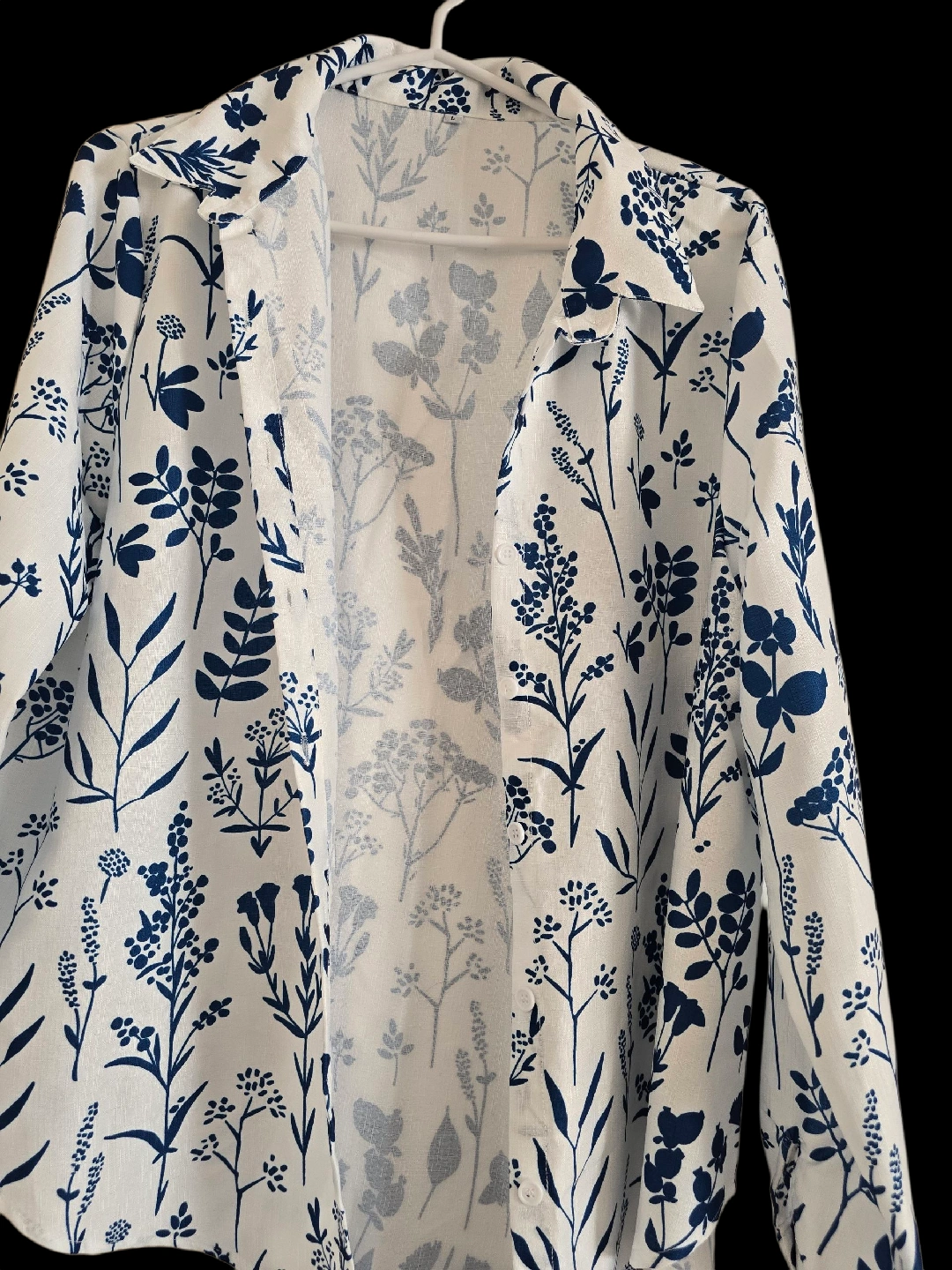 This is a long-sleeved shirt with a beautiful floral print. It's perfect for adding a touch of nature to your wardrobe. The shirt features a white background with a navy blue floral pattern. It's in great condition and ready for a new home
