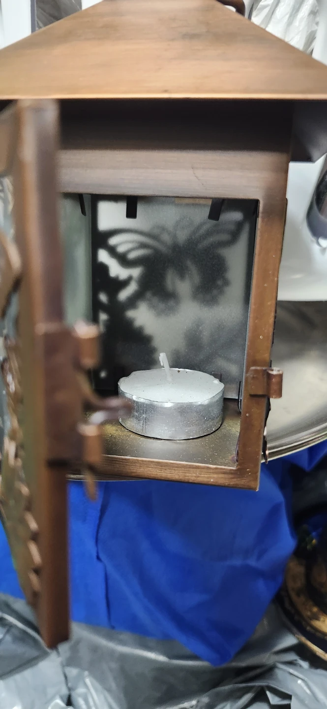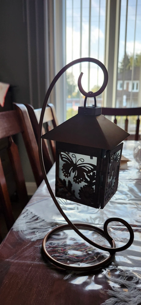 This is a cute metal lantern with a stand. It features butterfly and floral cutouts on the sides. Perfect for adding a touch of whimsy to any room! price only cash only pickup no delivery meet up 801 O'Connor drive East York outside TD Canada Trust bank door.