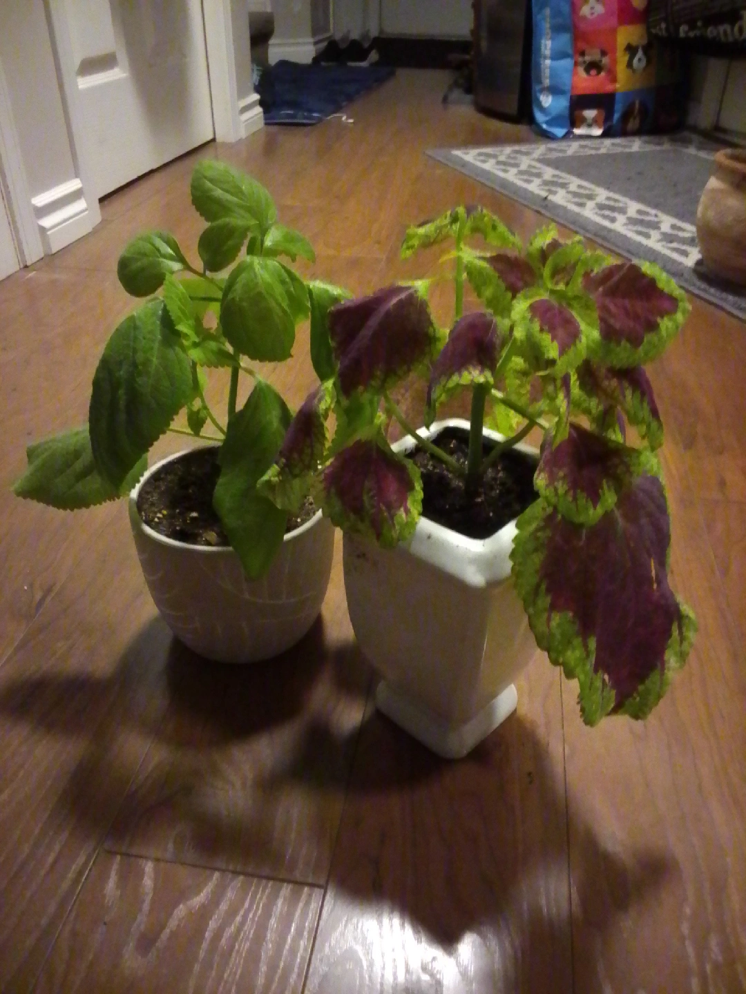 Two potted plants for sale! One is a coleus plant with vibrant purple and green leaves in a square pot, and the other is a green plant in a round pot. They're both healthy and ready to brighten up your space, grow year round, just pluck off the Flowers and they'll grow more, the price is for both potted plants, make an offer please and thank you.