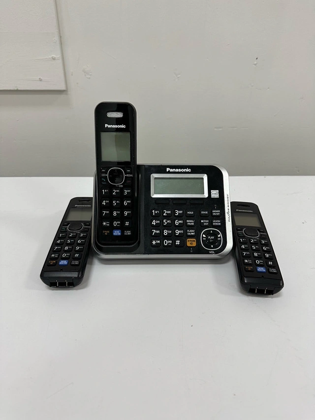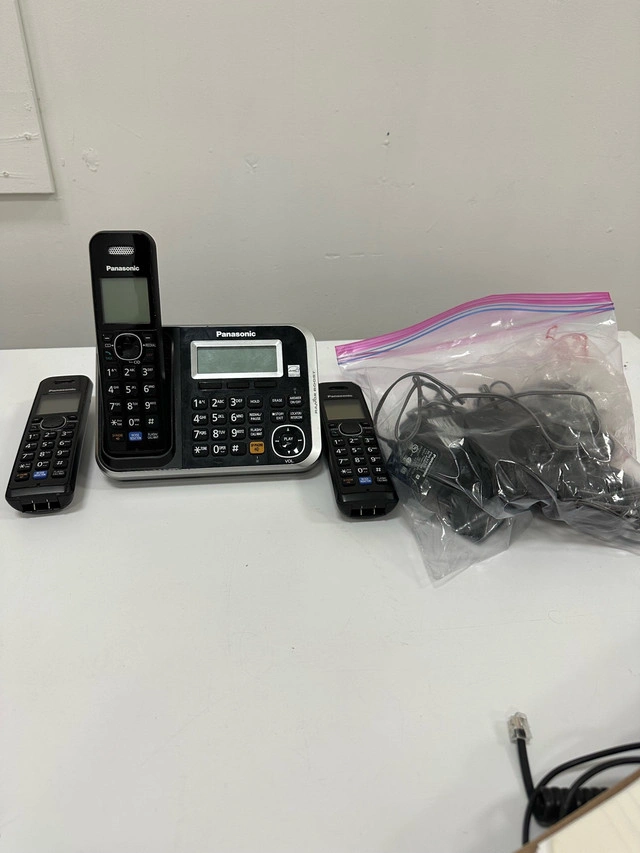 27I'm selling a used Panasonic cordless phone system with three handsets. The system is in good working order and includes the base station and three handsets. It features DECT 6.0 technology for clear, interference-free calls. The handsets have caller ID, call waiting, and a built-in answering machine. Perfect for home or small office use. This item is in used condition. Asking $35 for the system.