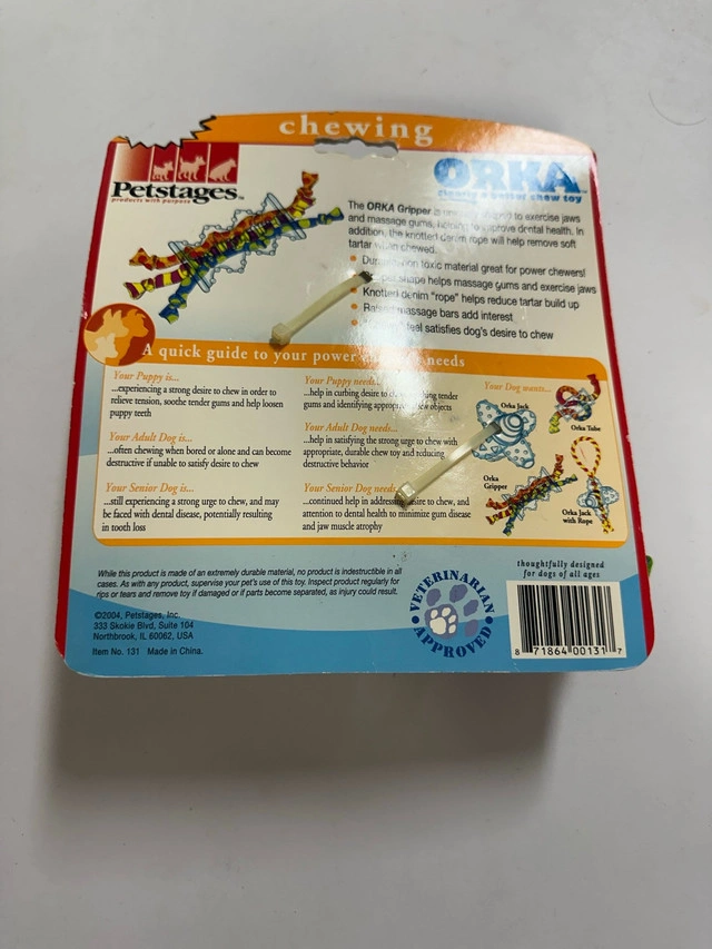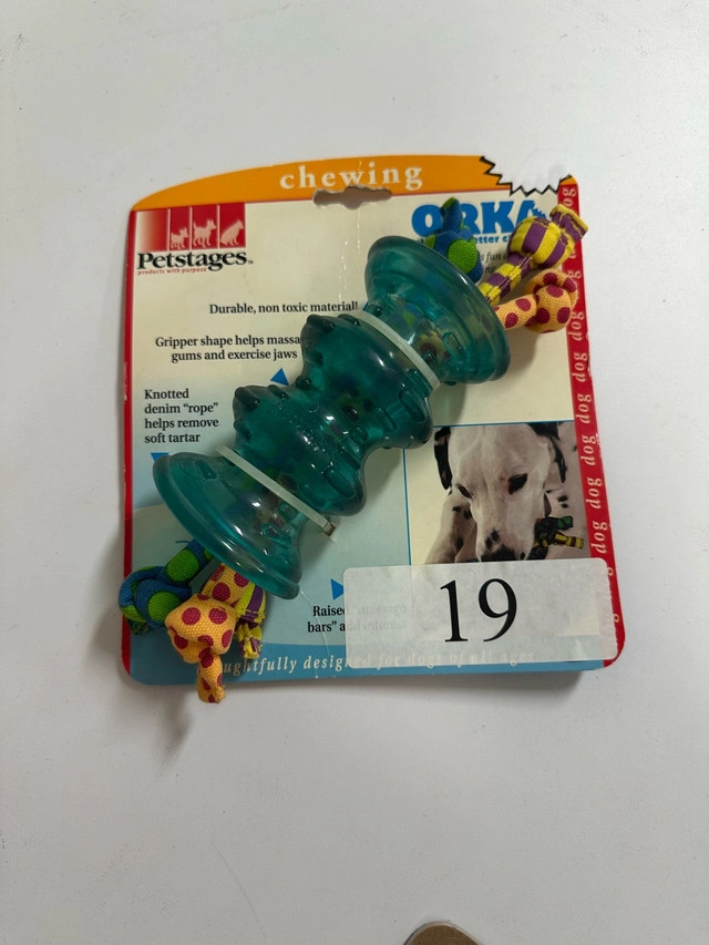 19This is a used Petstages Orka chew toy for dogs, designed with durable, non-toxic material to ensure your pet's safety while they enjoy chewing. The toy features a unique gripper shape to massage gums and exercise jaws, along with knotted denim rope to help remove soft tartar build-up, promoting better dental health. Specifications: - Durable, non-toxic material - Gripper shape for gum massage and jaw exercise - Knotted denim rope for tartar removal This toy is in used condition. If the ad is still up, it's still available! Cash accepted