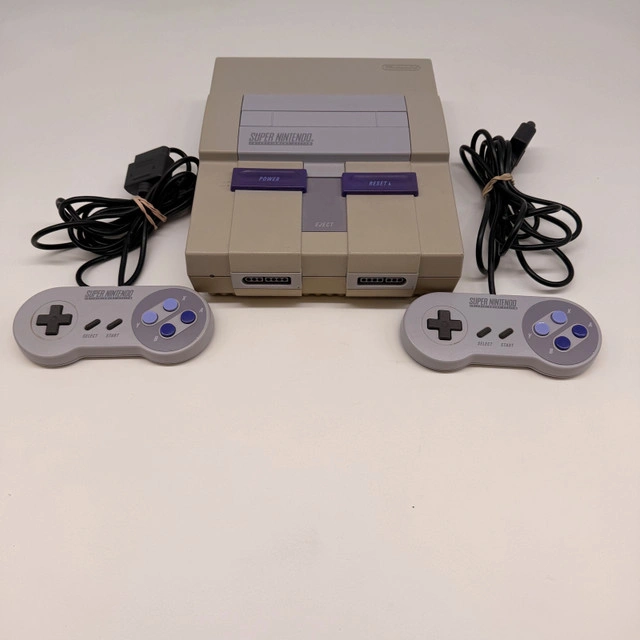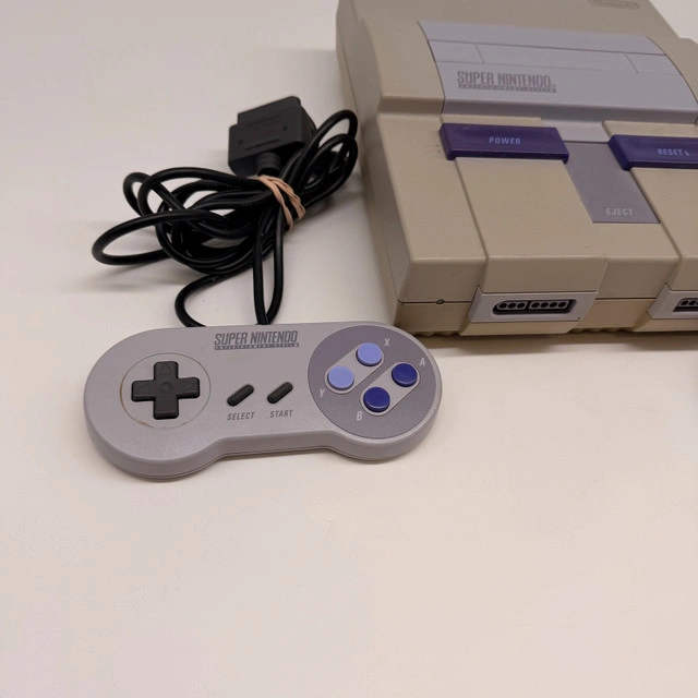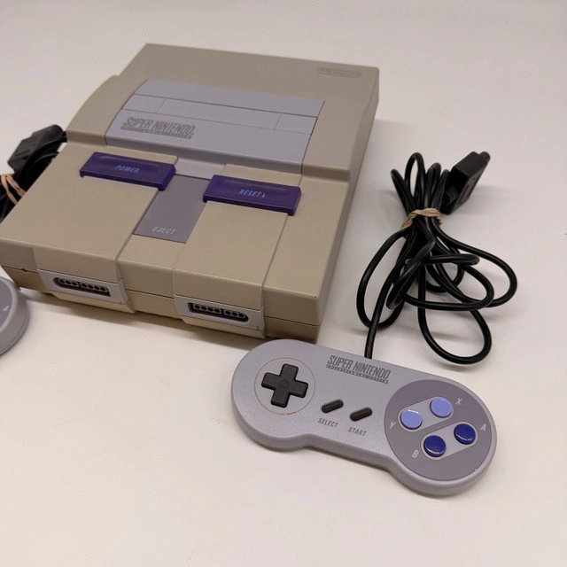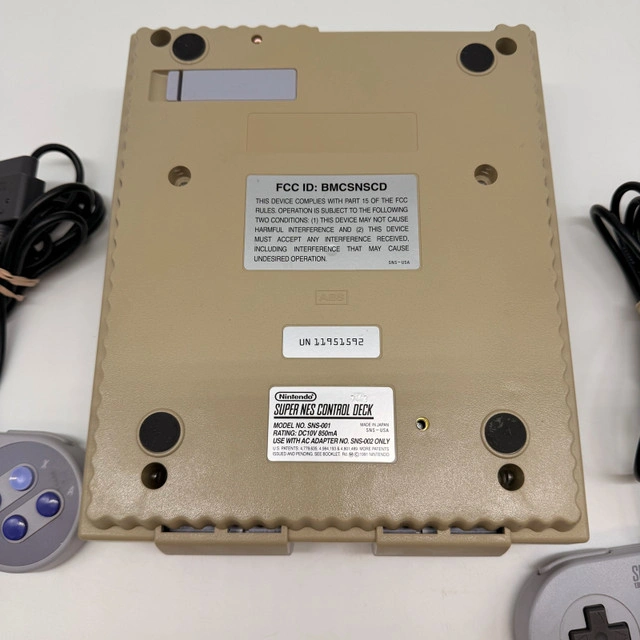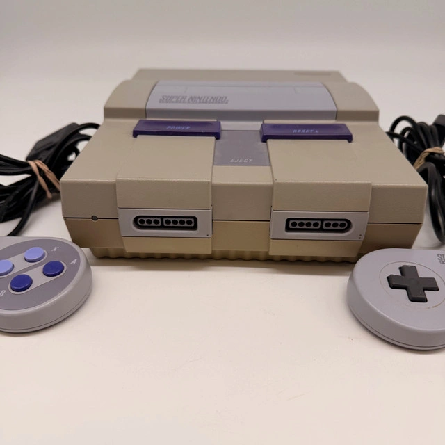 Original Super Nintendo Entertainment System (SNES) model SNS-001. Includes: • SNES console • 2 wired original controllers • Power and reset buttons fully intact • FCC ID: BMCSNSCD • Made in Japan ⚠️ Note: No power adapter or AV cable included. Console and controllers show normal signs of age (yellowing on plastic). Perfect for collectors or retro gaming enthusiasts!