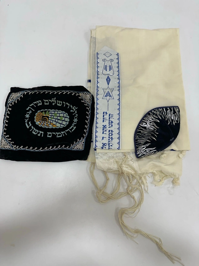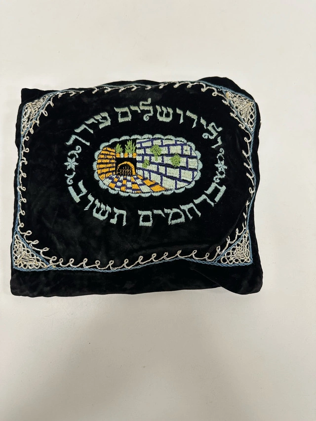 This Jewish prayer set includes a Tallit (prayer shawl) with a white base and blue embroidery, a matching Kippah (skullcap), and a beautiful black velvet embroidered bag to store them in. This set has been gently enjoyed. This set is a meaningful addition to anyone's religious practice. I'm pricing this set at $80. If this ad is still up, the item is still available!