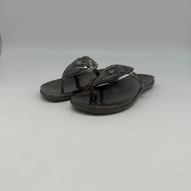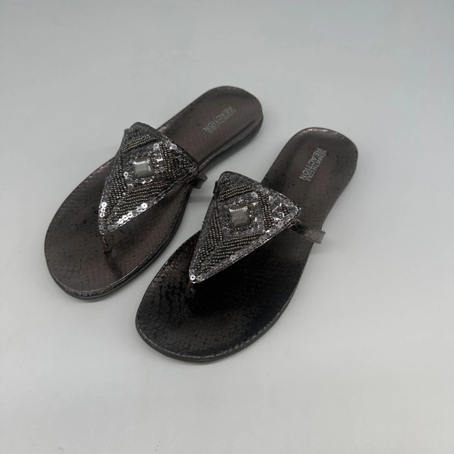 These brand new Kenneth Cole Reaction women’s sandals are a size 9 and feature a stylish design with beaded embellishments, perfect for adding a touch of sparkle to any outfit. These sandals come in their original box, ensuring they are pristine and ready to wear. Key features include: * Size: 9 * Brand: Kenneth Cole Reaction * Colour: Dark Grey * Style: Thong sandal with beaded detail * Condition: Brand new in box