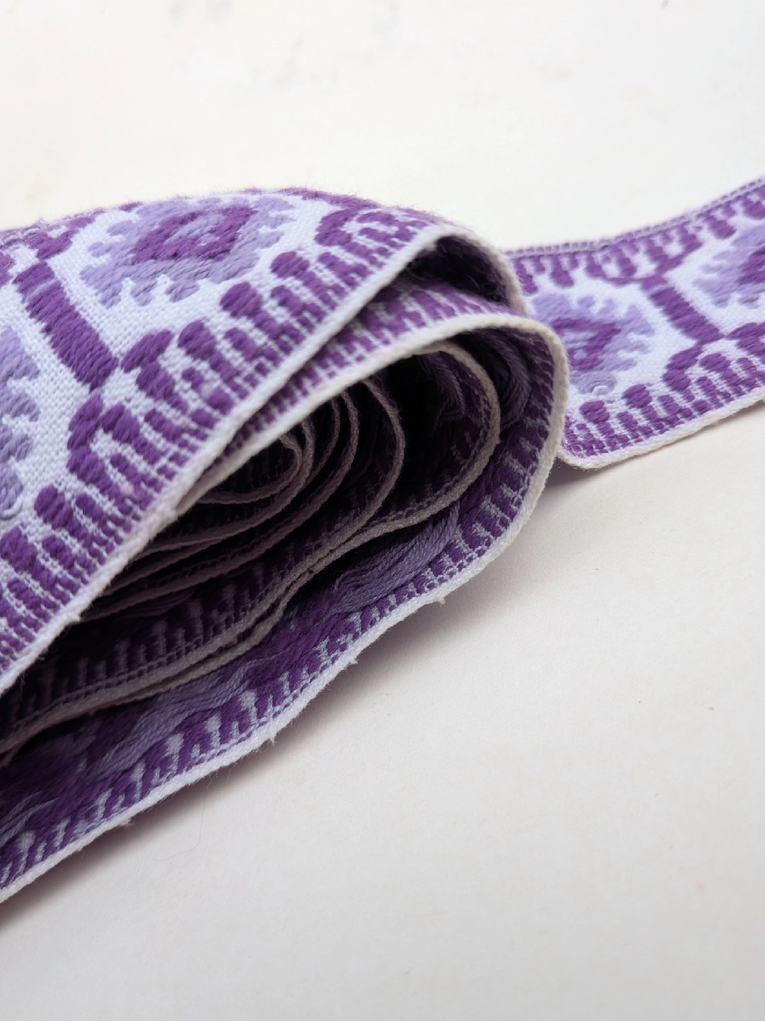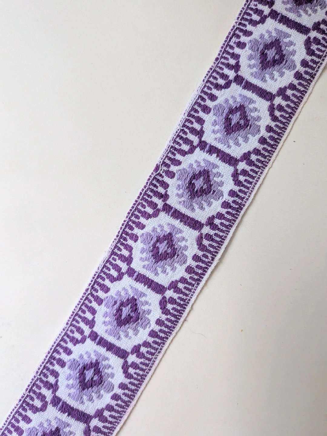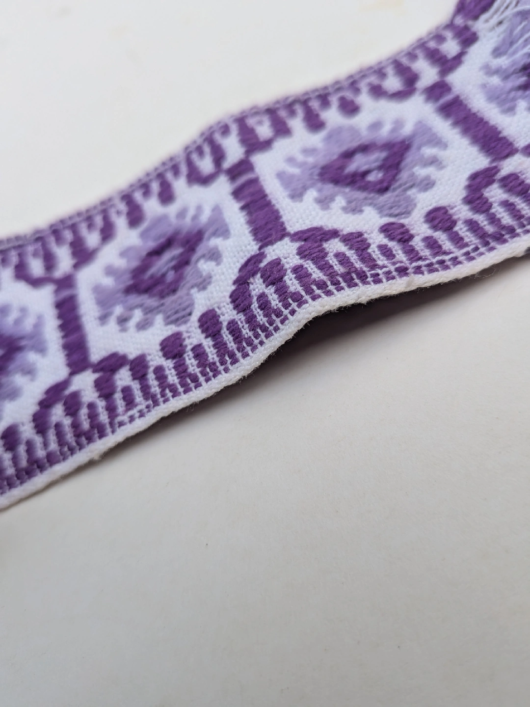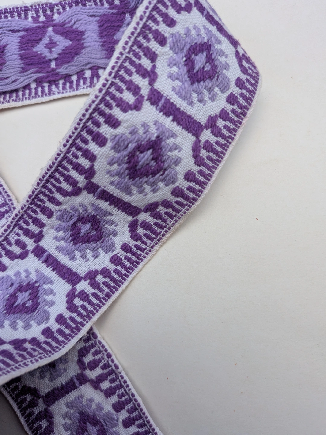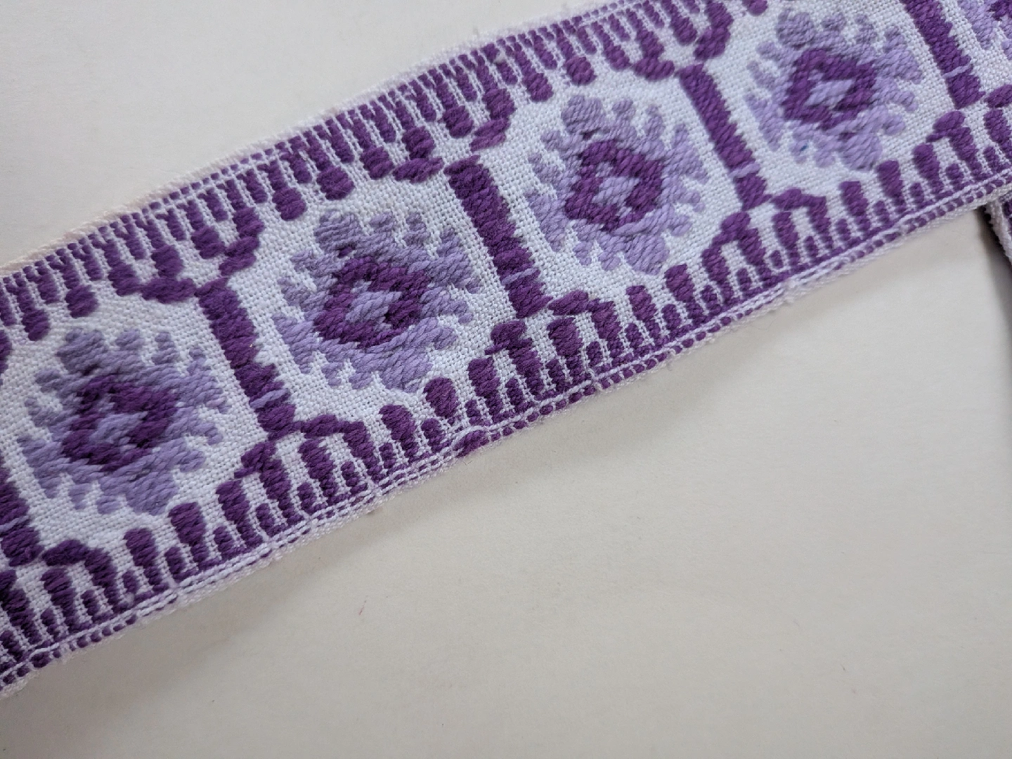 157Rare, hard to find beautiful hand woven vintage purple and white embroidered trim From the 1950's era It features a repeating floral and geometric pattern One piece that is about 2 yards long. Width is almost 2 inches wide Cash only, no etransfers Location: Etobicoke. Rathburn Rd and Renforth dr. Etobicoke Olympium nearby