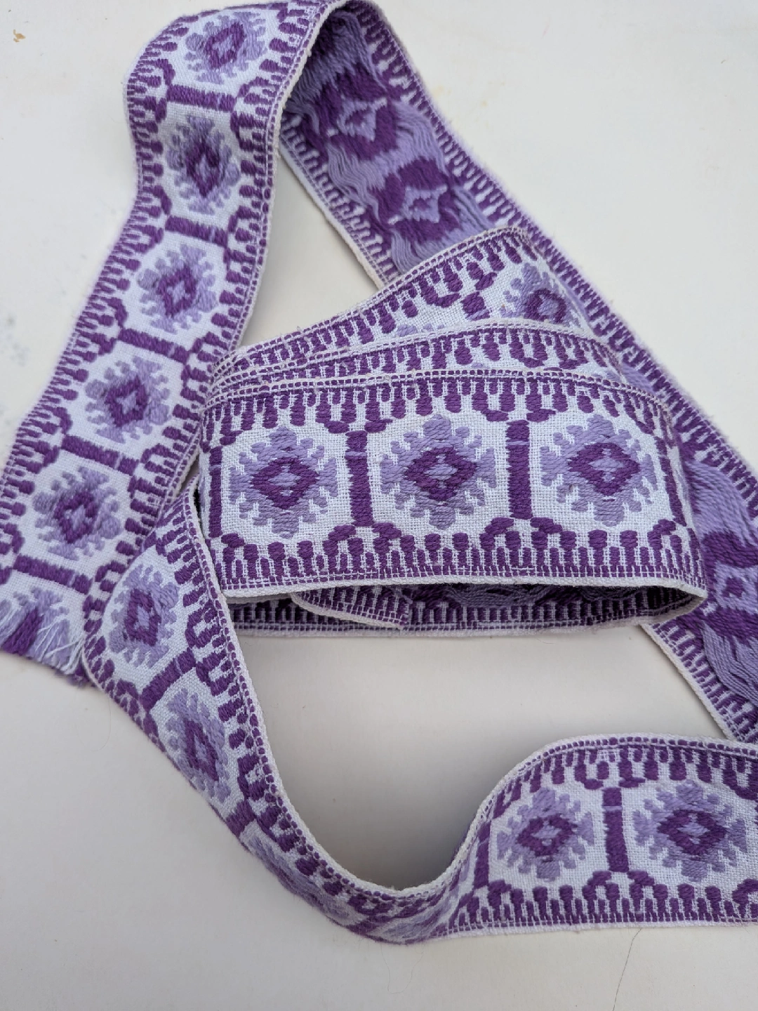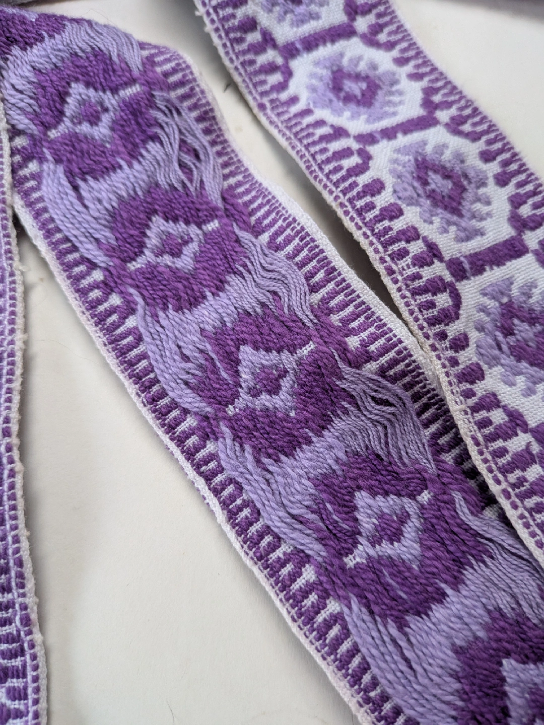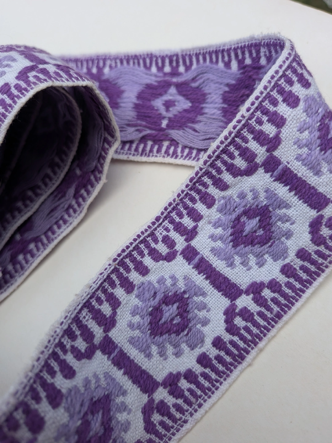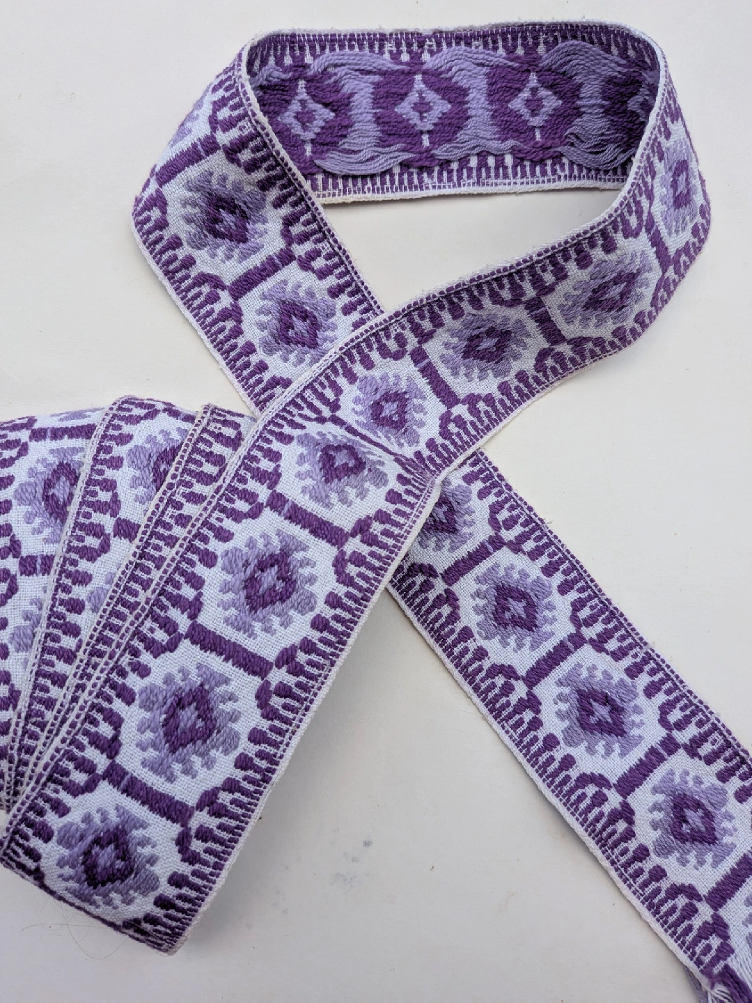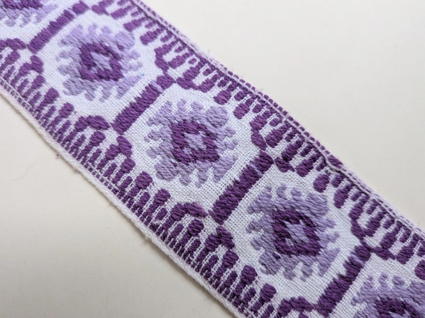 157Rare, hard to find beautiful hand woven vintage purple and white embroidered trim From the 1950's era It features a repeating floral and geometric pattern One piece that is about 2 yards long. Width is almost 2 inches wide Cash only, no etransfers Location: Etobicoke. Rathburn Rd and Renforth dr. Etobicoke Olympium nearby