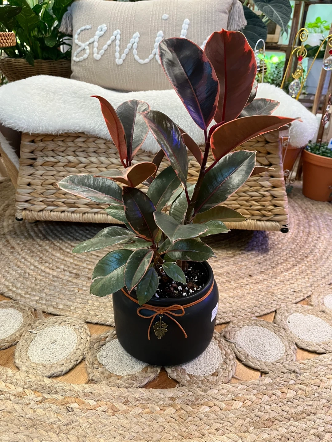 Beautiful Ficus Elastica Ruby plant that features striking dark green leaves with vibrant ruby red edges. It comes in a 5β nursery pot as well as the decorative black ceramic pot with a leaf charm seen in pic.