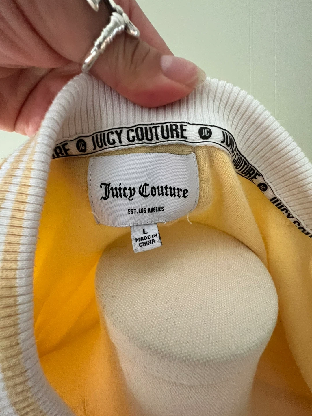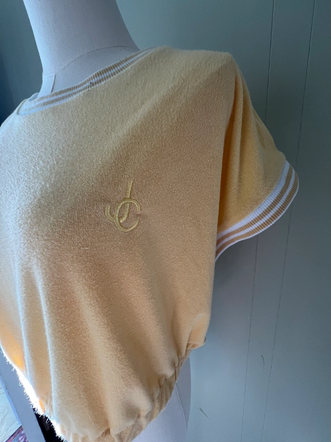 Selling a cute Juicy Couture cropped top in a soft yellow terry material. It's a size L and has a sporty, retro vibe with white stripes on the sleeves and neckline. Perfect for a casual, comfy look!