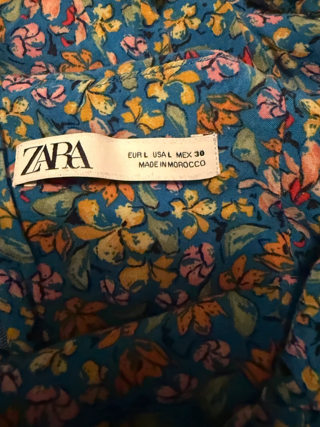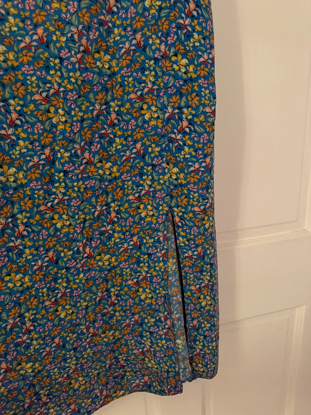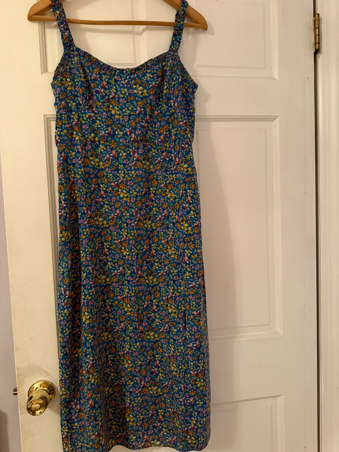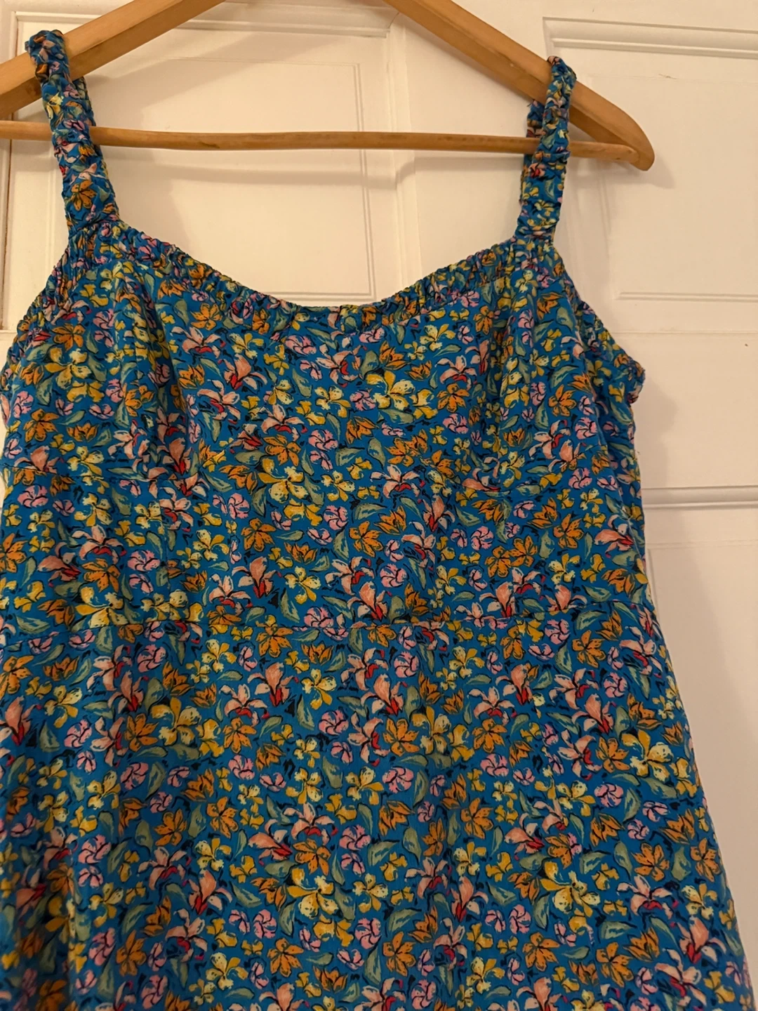 211This is a lovely floral print dress. It's in great condition and features a vibrant pattern with blue, yellow, and orange flowers. Perfect for a sunny day out!