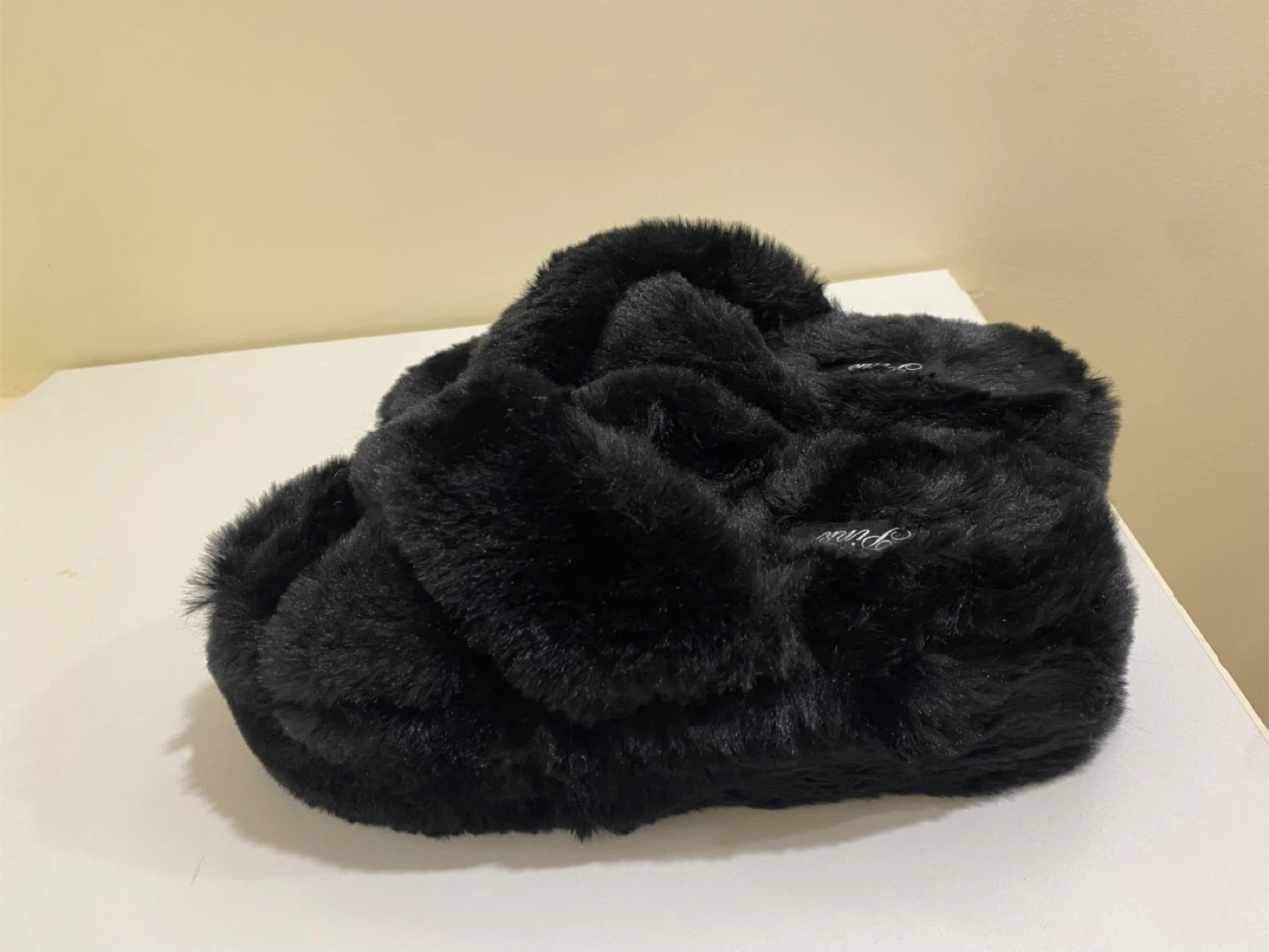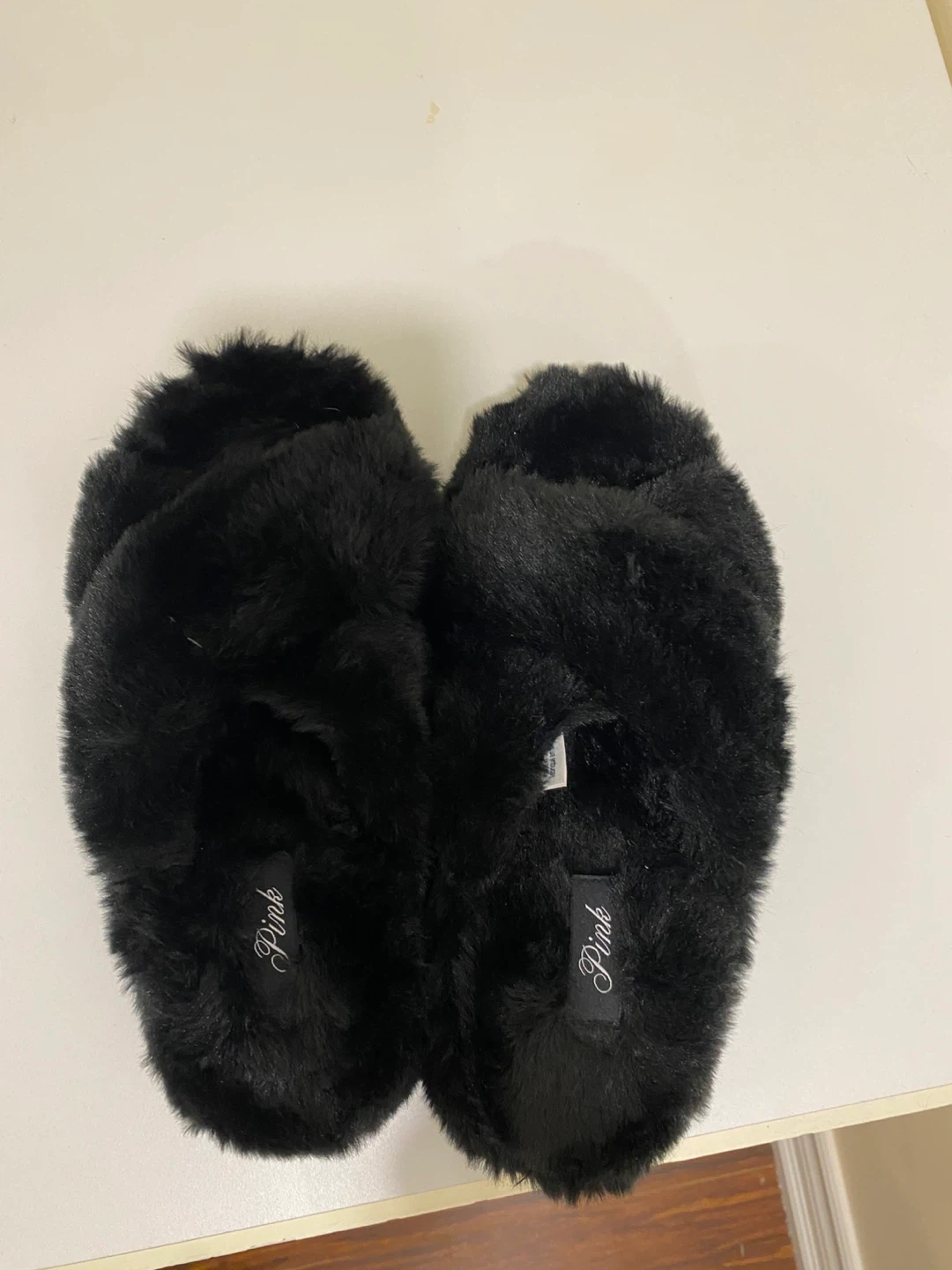 Cozy up with these super comfy black fuzzy slippers from Pink! They're perfect for lounging around the house. The slippers are in great condition and ready for a new home