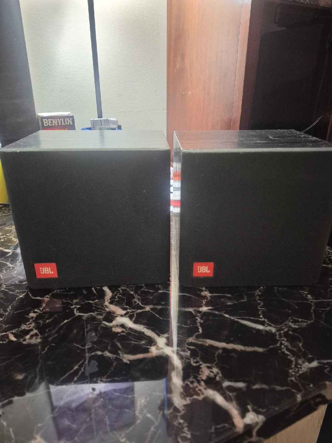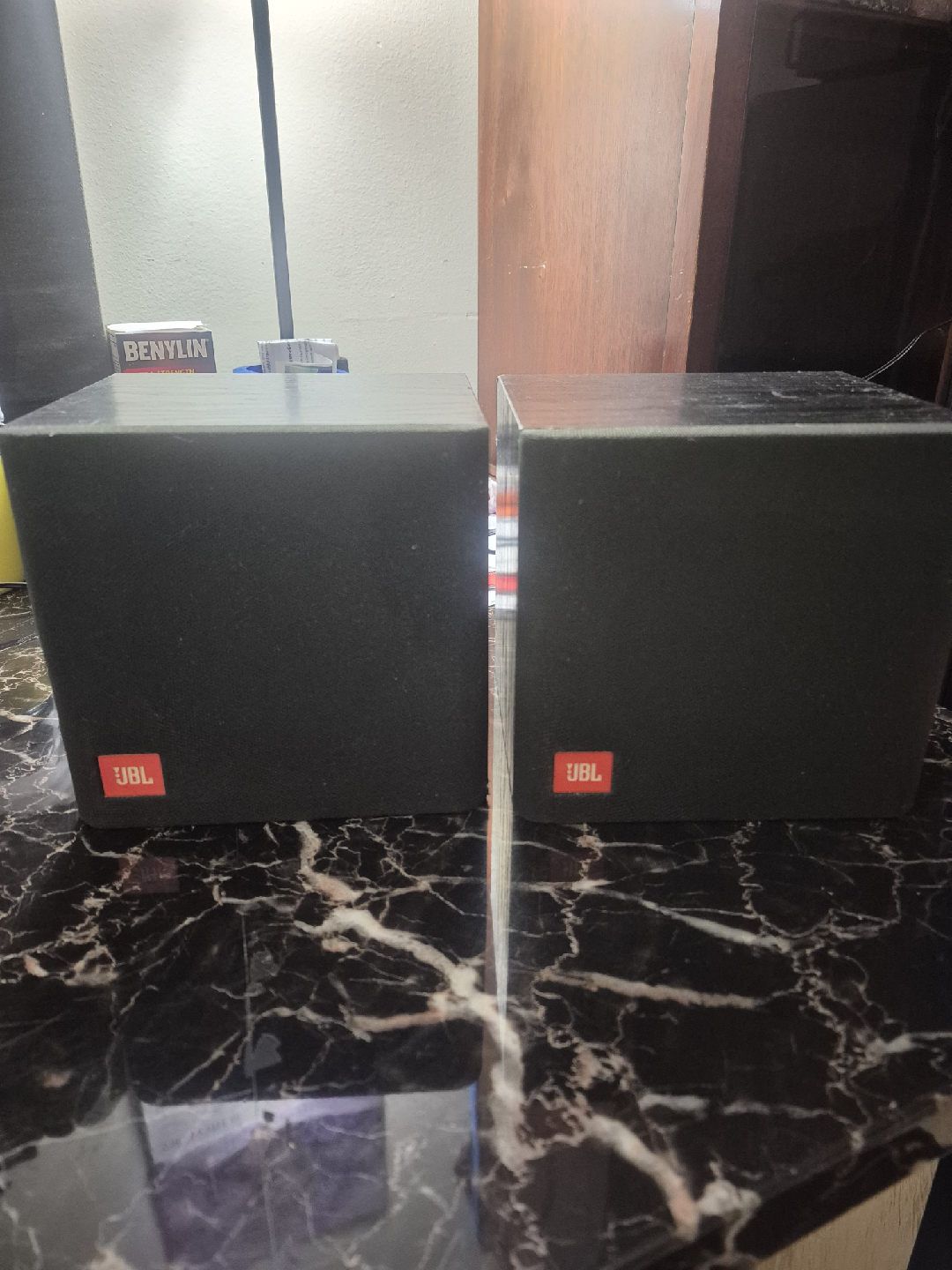 Selling a pair of (JBL Flix 1) 2 pieces Surround speakers. They're in good condition and ready to enhance your sound system. The speakers have a compact, cube-like design with the JBL logo prominently displayed on the front. They feature connectors on the back for easy setup. Perfect for creating a surround sound experience in your home!