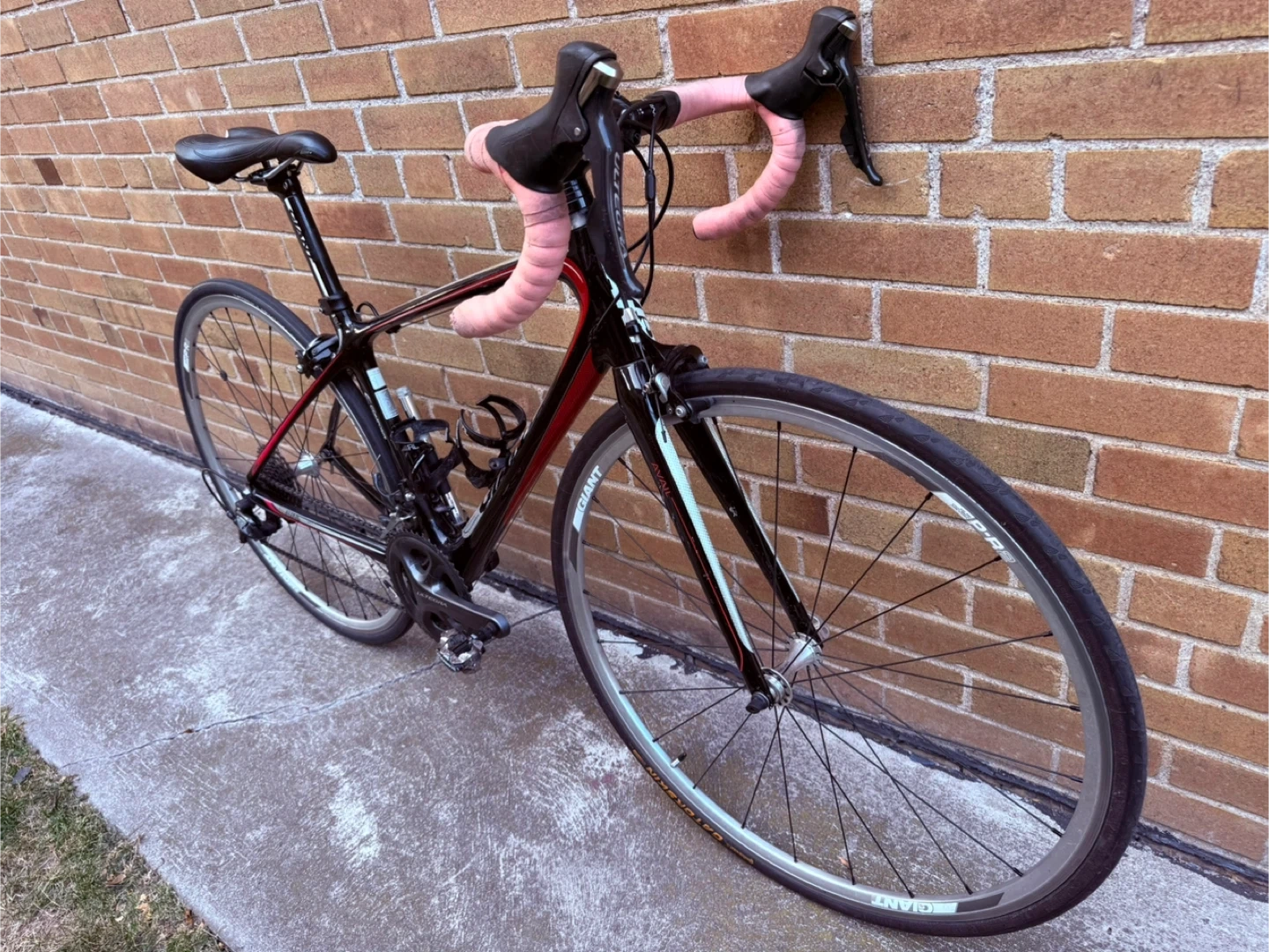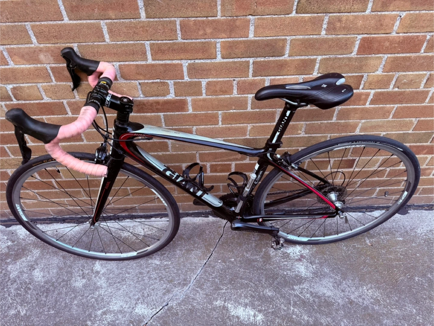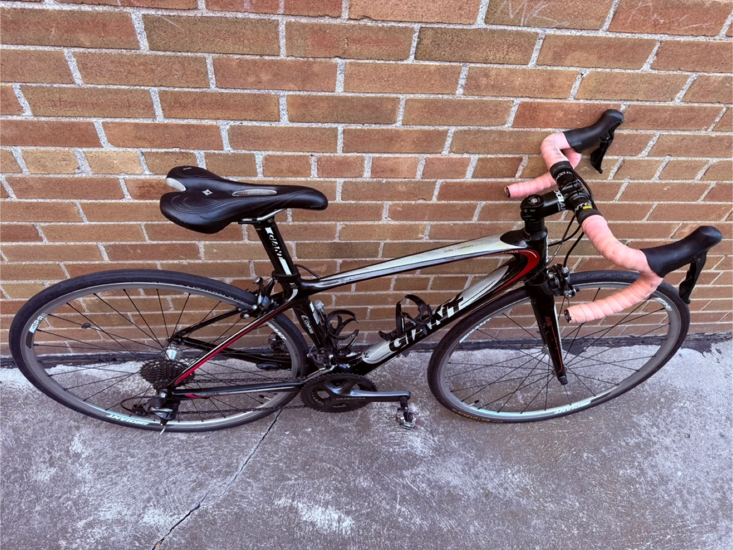 Selling a Giant Avail road bike in black and red. It's in great shape and ready for some rides around town or on the trails. The bike features a comfortable seat and smooth gear shifting for a pleasant cycling experience. Perfect for someone looking to get into road biking or upgrade their current ride!