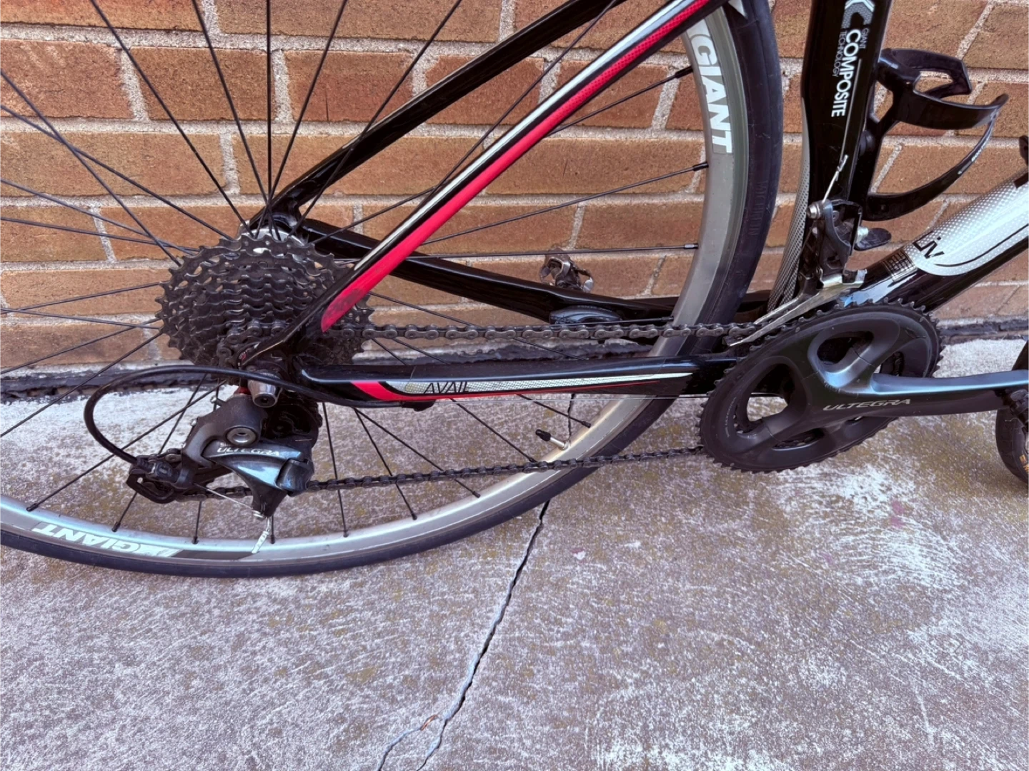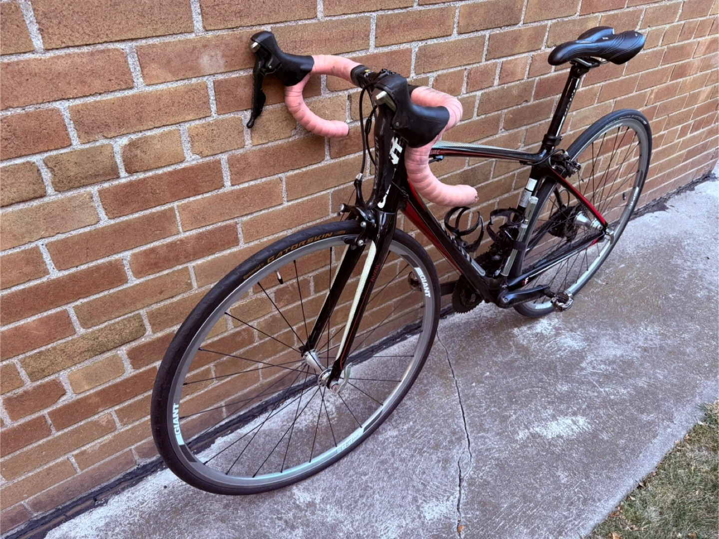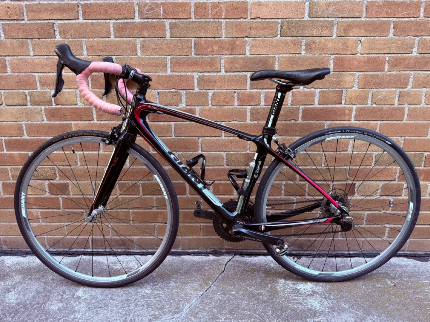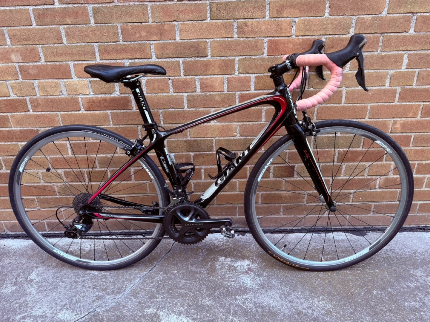 Selling a Giant Avail road bike in black and red. It's in great shape and ready for some rides around town or on the trails. The bike features a comfortable seat and smooth gear shifting for a pleasant cycling experience. Perfect for someone looking to get into road biking or upgrade their current ride!