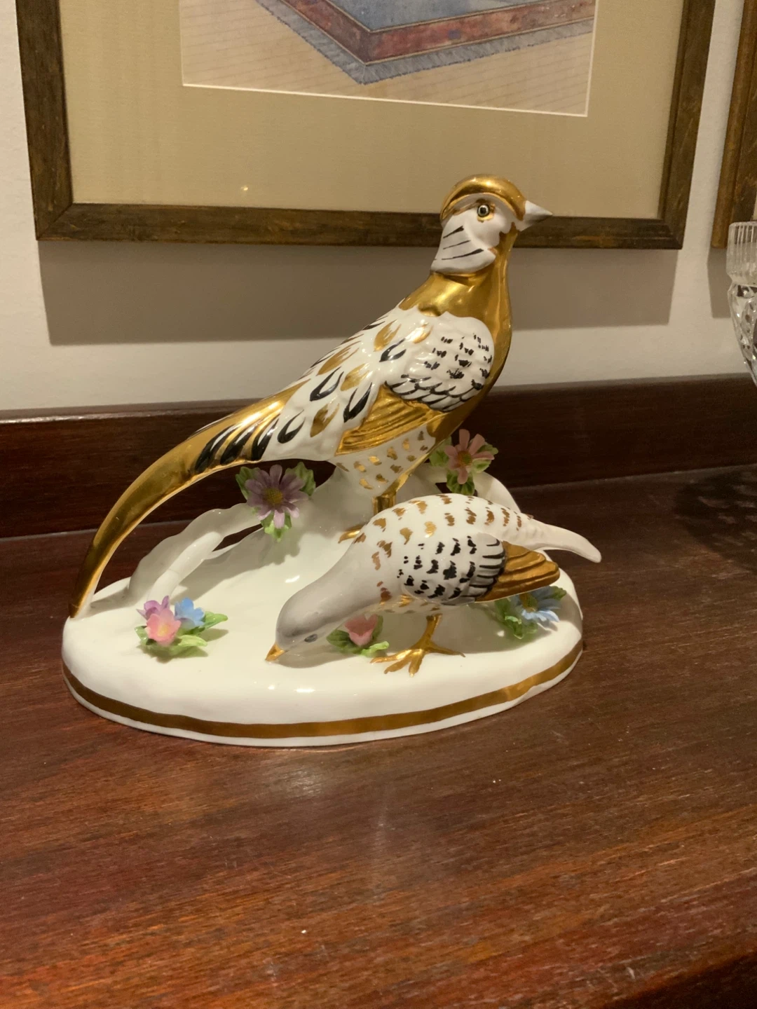 The figurine appears in excellent condition other than tiny petal missing and a very fine hairline surface only crack on the underside of the base ,but everything is not noticeable and the colours are still very vibrant and the gold is perfect as well