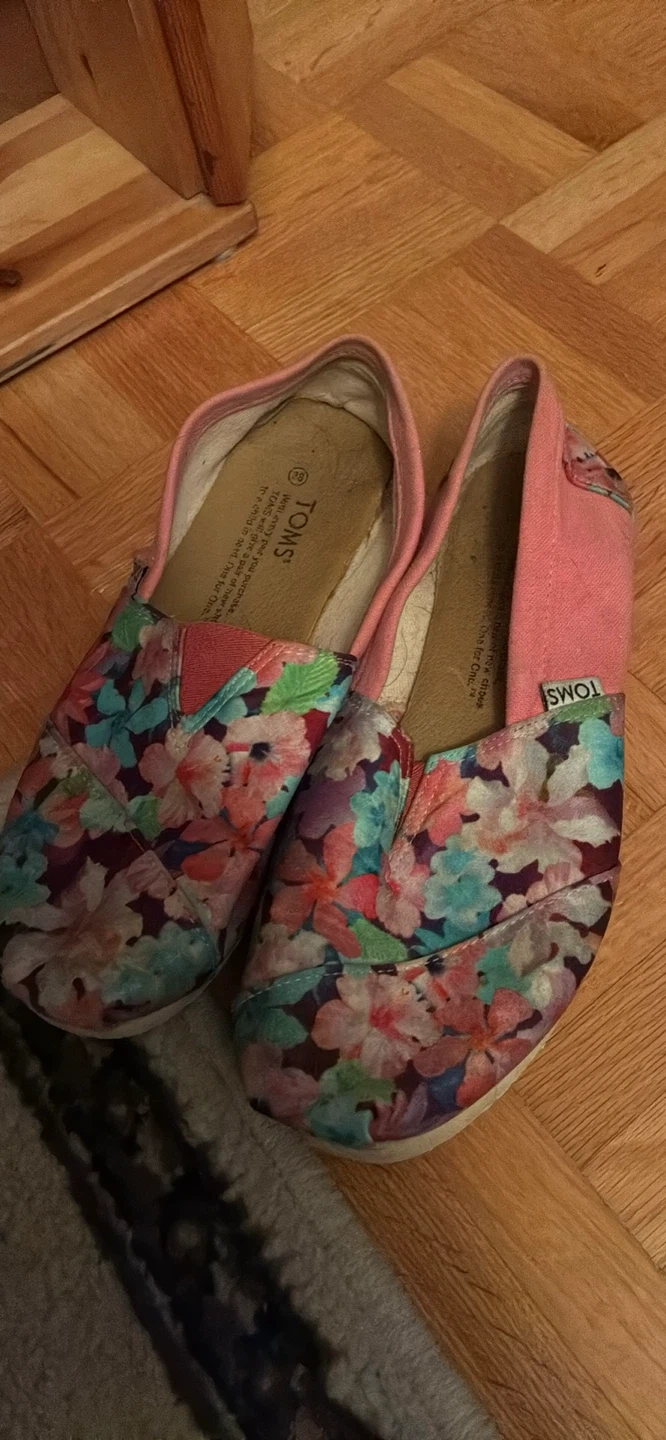 Cute floral TOMS slip-on shoes! They're a women's size 7 and have a colourful floral pattern. Perfect for spring or summer!
