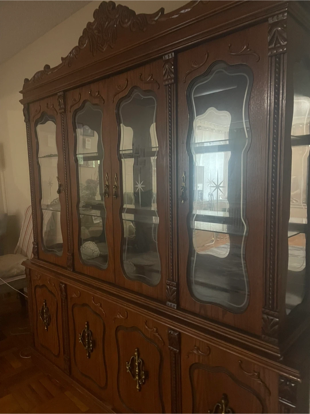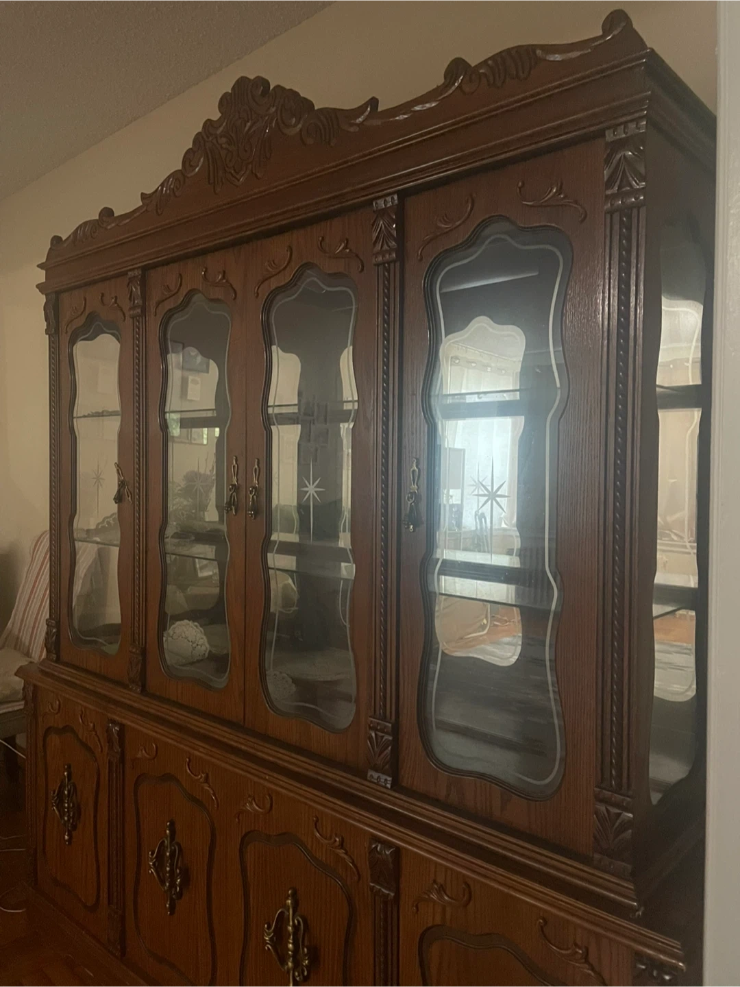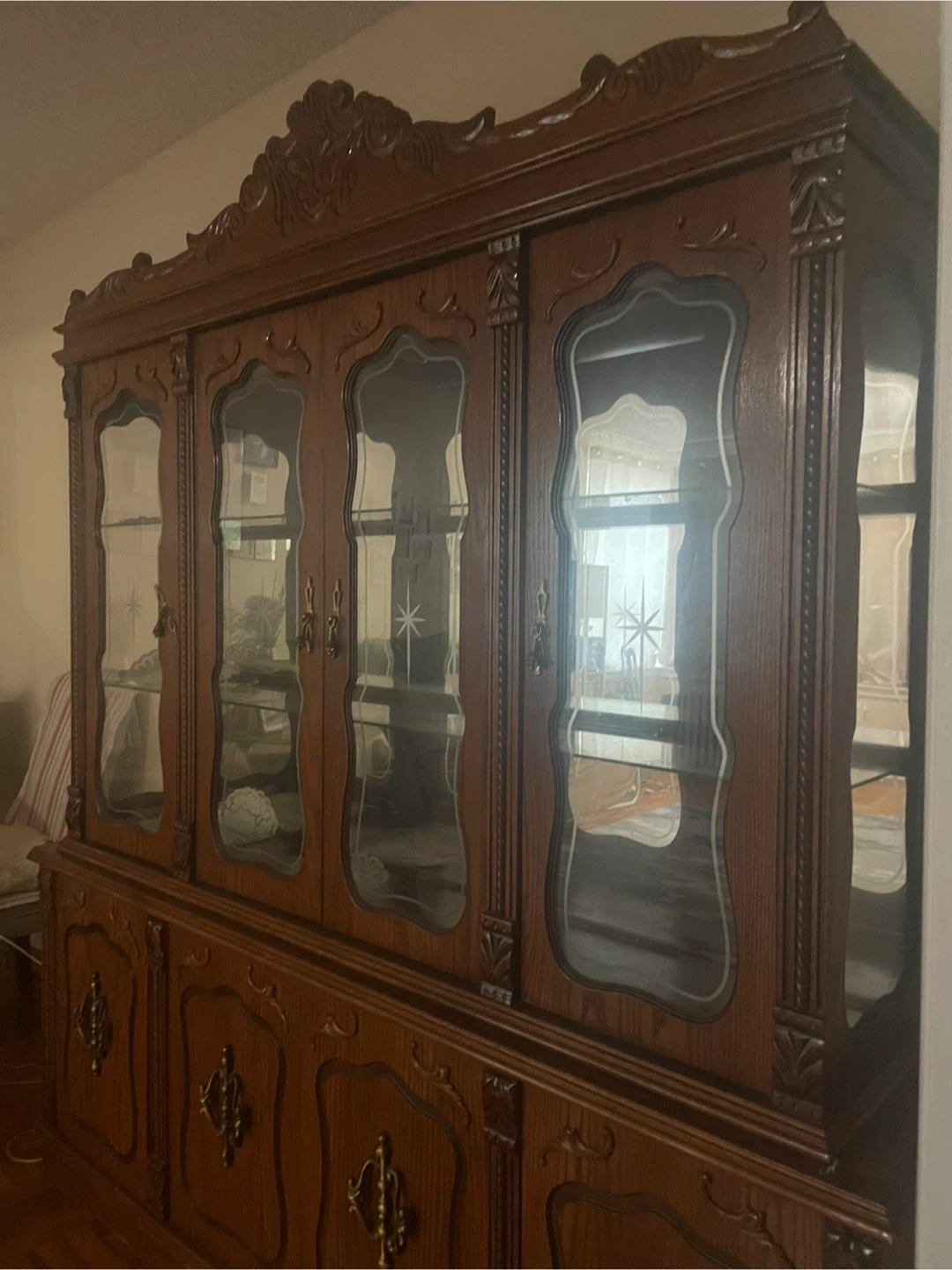 Selling a beautiful antique wood china cabinet. It features intricate detailing and glass-fronted doors, perfect for displaying your cherished items. The cabinet is in good condition and would make a stunning addition to any dining room or living space. Pick up only.
