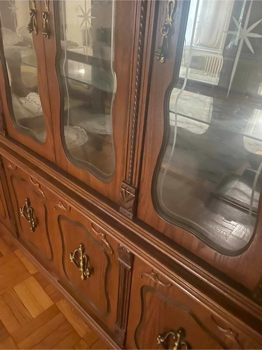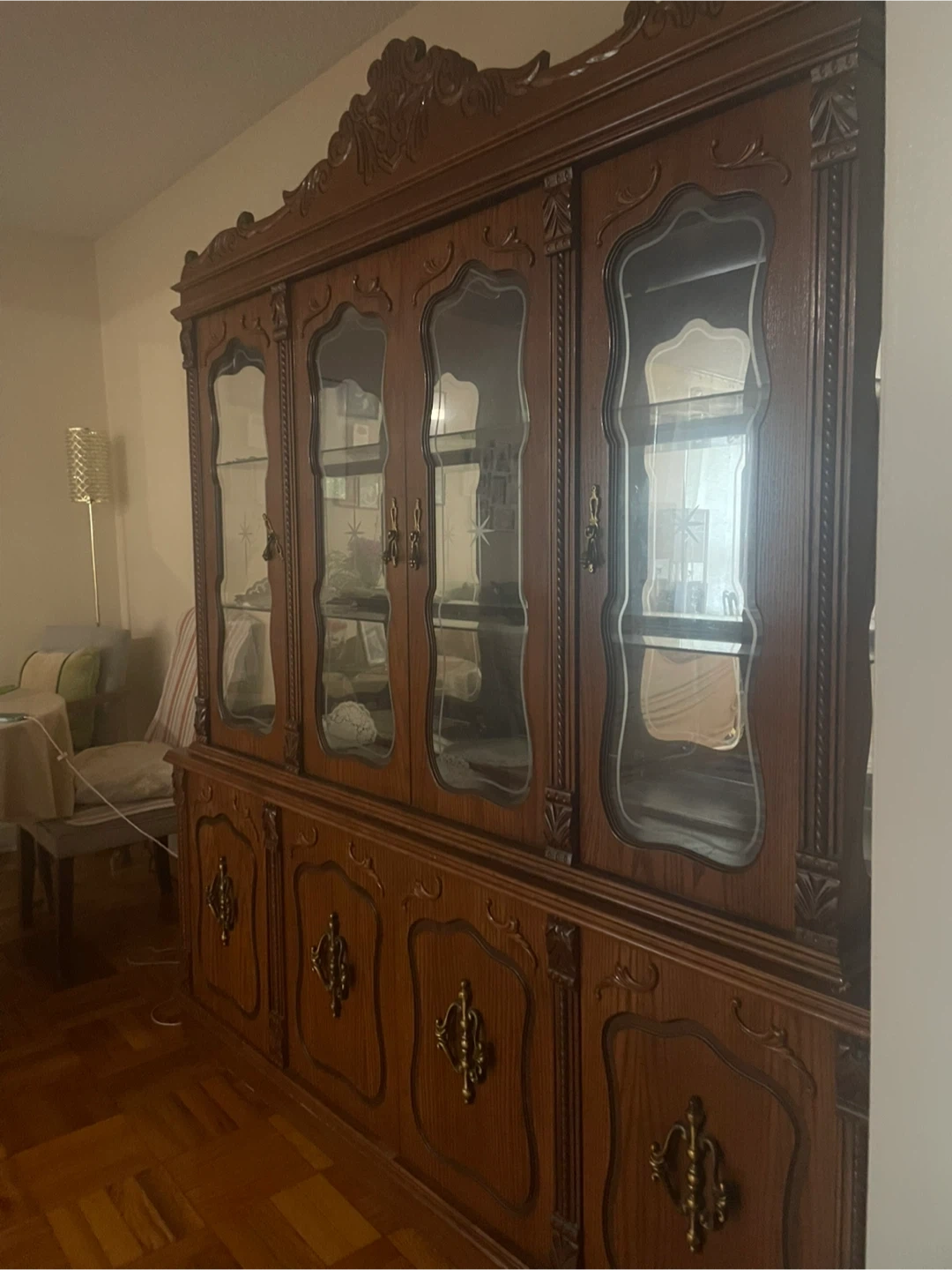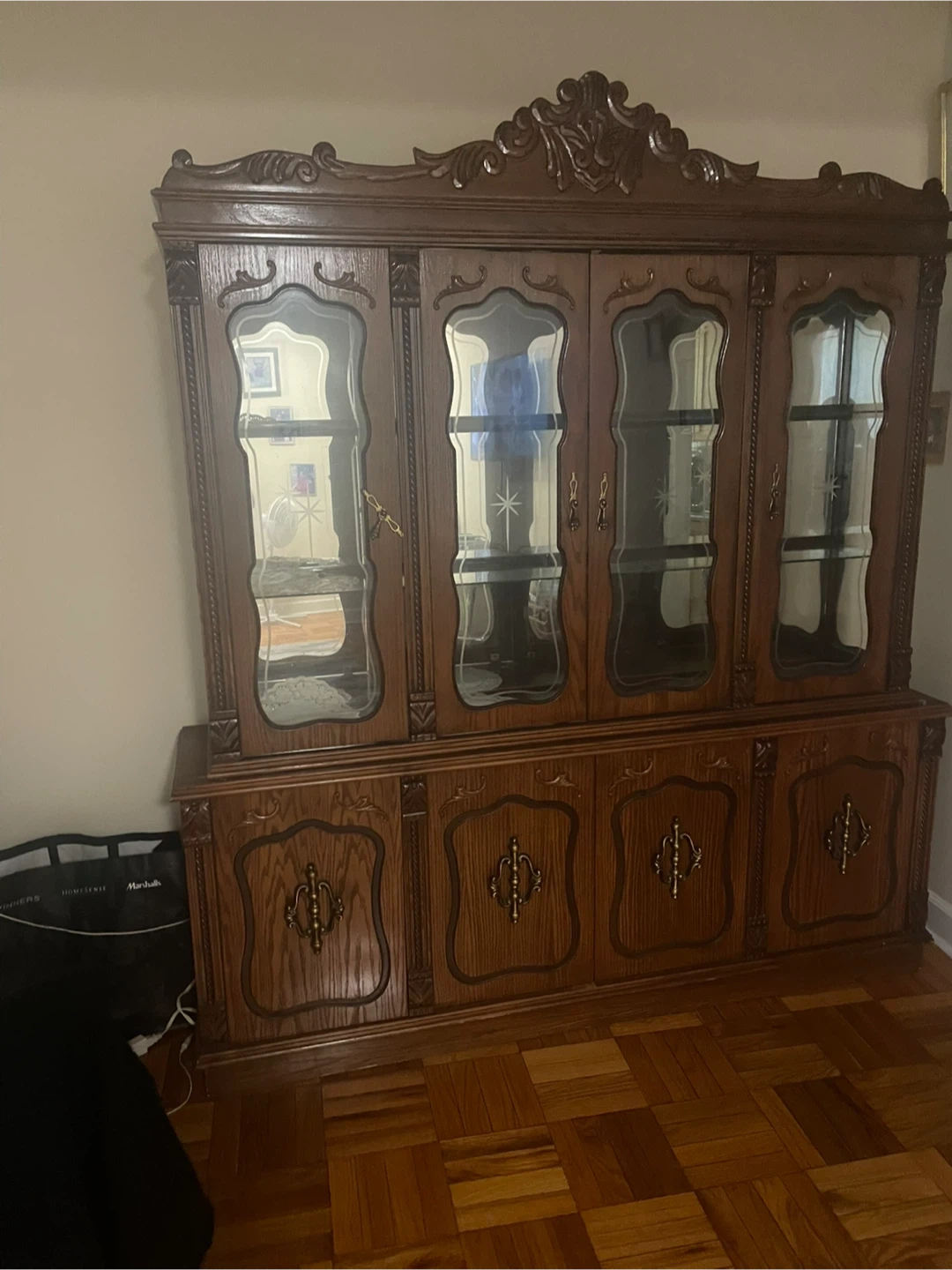 Selling a beautiful antique wood china cabinet. It features intricate detailing and glass-fronted doors, perfect for displaying your cherished items. The cabinet is in good condition and would make a stunning addition to any dining room or living space. Pick up only.