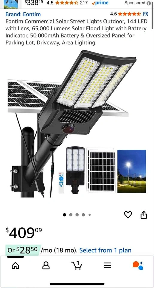 Eontim Commercial Solar Street Lights Outdoor, 144 LED with Lens, 65,000 Lumens Solar Flood Light with Battery Indicator, 50,000mAh Battery & Oversized Panel for Parking Lot, Driveway, Area Lighting. Price firm.