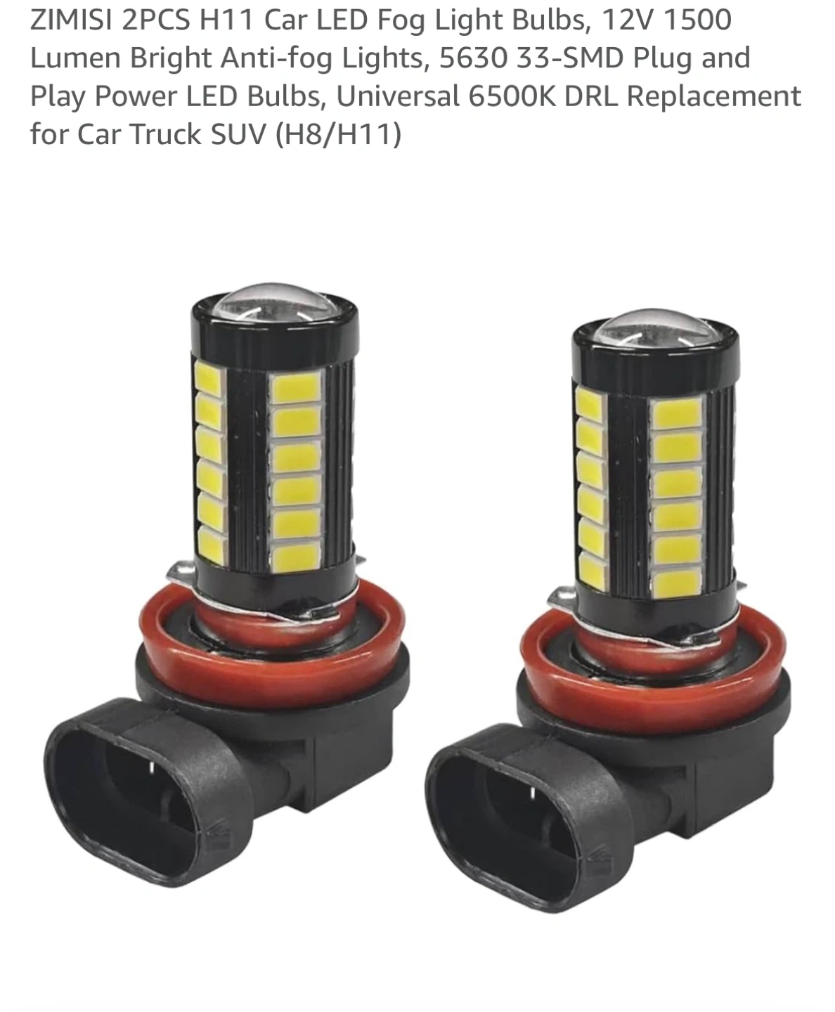380ZIMISI H11 Car LED Fog Light Bulbs a new pair of H11 car LED fog light bulb. It's a 12V 1500 Lumen bright anti-fog light with 5630 33-SMD plug and play power LED bulbs. It's a universal 6500K DRL replacement for car, truck, and SUV (H8/H11)