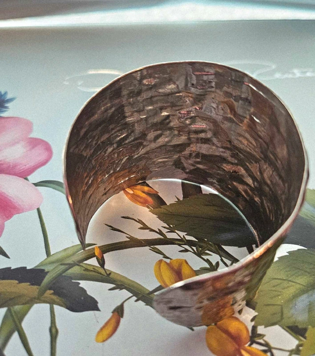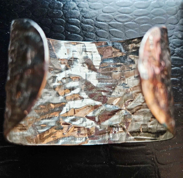 This is a stunning sterling silver cuff bracelet, perfect for adding a touch of glamour to any outfit. Its unique textured design catches the light beautifully. I estimate the value to be in the 25-40 dollar range, looking at similar listings. If the ad is still up, then yes, it is still available! Adjustable, fits average, small to large