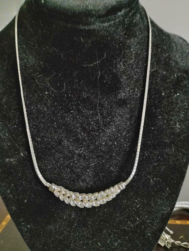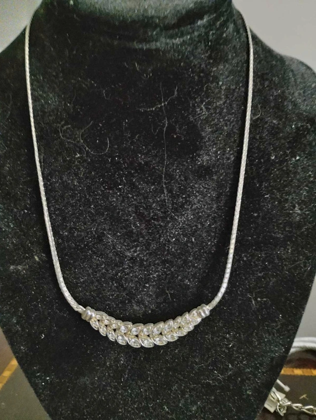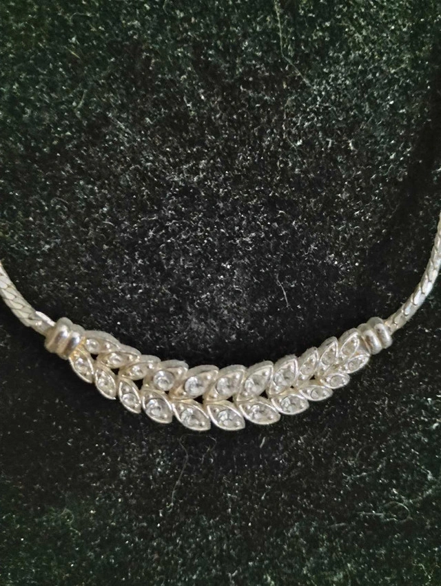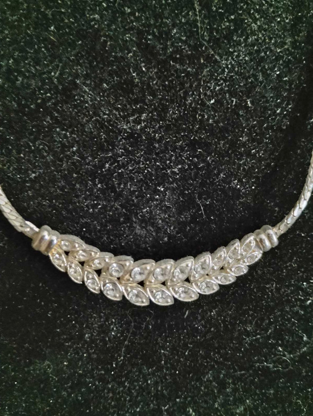 This elegant vintage necklace features a delicate, leaf-patterned design adorned with shimmering crystals, perfect for adding a touch of sparkle to any outfit. Adjustable length. Dainty and classy to go with that special dress for your Prom or that special occasion.