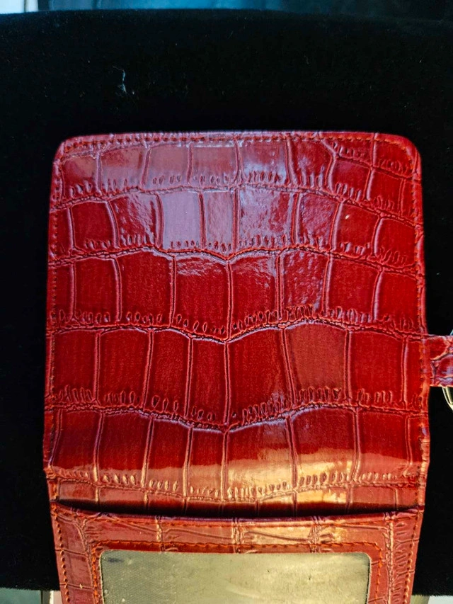 This eye-catching red card holder, in a used condition, combines both fashion and functionality. Perfect for keeping your essential cards secure and accessible, it's a stylish accessory for anyone on the go. Here are some details about this item: * Colour: Red * Texture: Embossed * Features: Key ring and lobster clasp