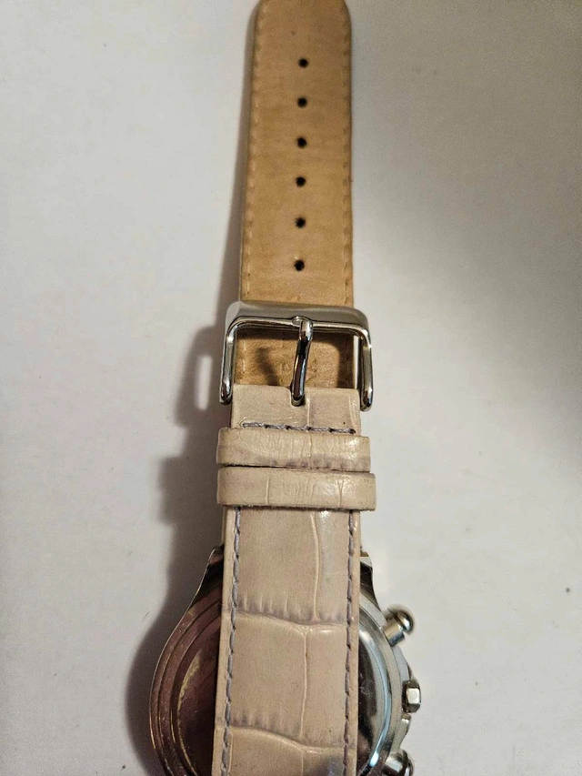 This is a used Chico's watch featuring a stylish design with crystal embellishments around the face. This timepiece is perfect for adding a touch of sparkle to your wrist! Needs a new battery.