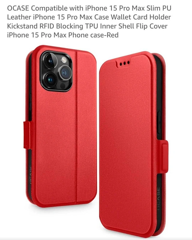 This OCASE iPhone 15 Pro Max slim PU leather case in red is like new and ready to protect your phone in style! It features a wallet card holder, kickstand, RFID blocking, and a TPU inner shell flip cover. Here are some of its features: * Slim design * PU leather material * Wallet card holder * Kickstand function * RFID blocking * TPU inner shell * Flip cover If you're reading this, it's still available!
