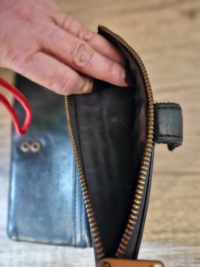 This is a Fossil brand black leather wallet, perfect for keeping your essentials organized. This bifold wallet features multiple card slots, a zippered coin pocket, and a snap closure. The wallet is used, showing some wear, but is still in good condition and has lots of life left. Here are some additional details: