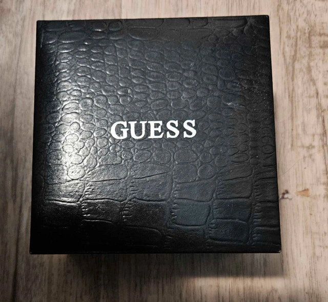 This used Guess watch features a rectangle face, stainless steel bracelet and decorative crystals. It's a very eye-catching accessory. Adjustable length, with easy add links. Comes with box for gift giving. Needs new battery.