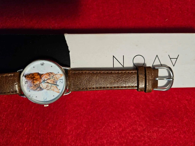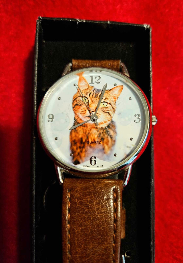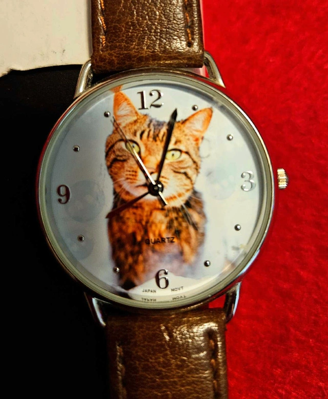 This is a Rachael Hale Quartz watch, featuring a charming cat design on the face, perfect for cat lovers. It has a brown leather strap and a stainless steel back. I would call it a unisex watch because it can be worn by anyone. The watch is in good working condition and keeps accurate time. Needs Battery.