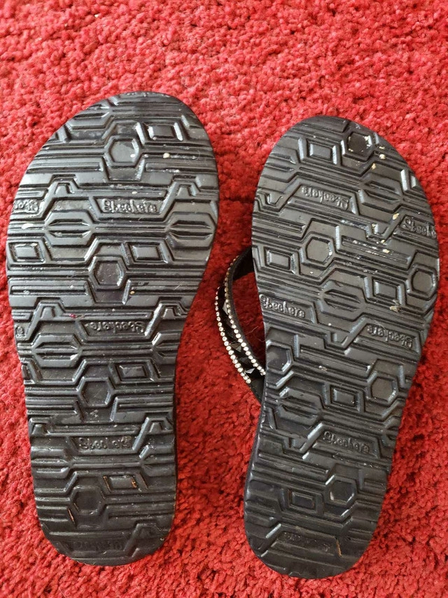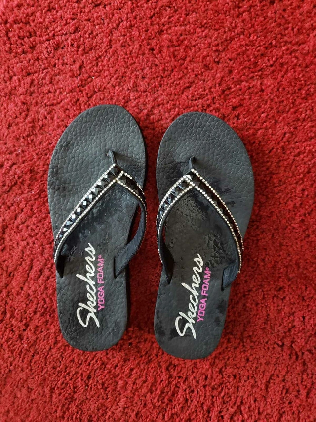 Size 6, skechers yoga foam saddles. Excellent condition. A couple tiny sparkles fell off but not noticeable. Non smoking home I just haven't really worn them. Let me know if you're interested!