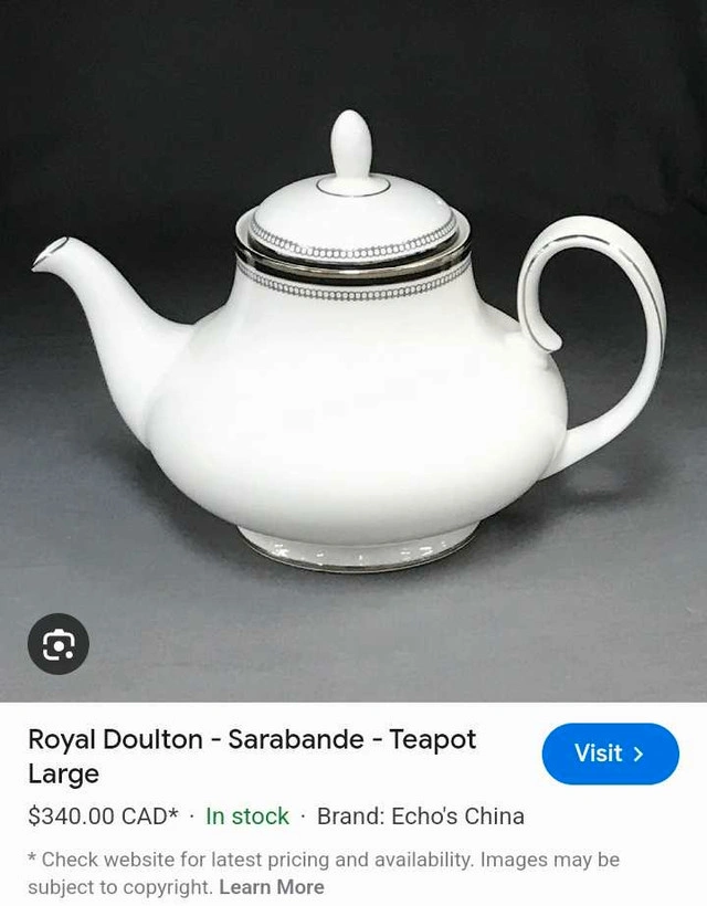 This is a Royal Doulton Sarabande Teapot, large sized, perfect for serving tea in style. It's in good condition, ready to be the centerpiece of your tea collection. Additional details: * Brand: Royal Doulton * Pattern: Sarabande * Type: Teapot * Size: Large Based on Kijiji and other online marketplaces, similar Royal Doulton teapots are typically priced between $250 and $400 CAD. This is priced competitively for a quick sale. Imagine all the delightful tea parties you could host with this beauty! Just a friendly heads-up: if you're seeing this ad, the teapot is still up for grabs!