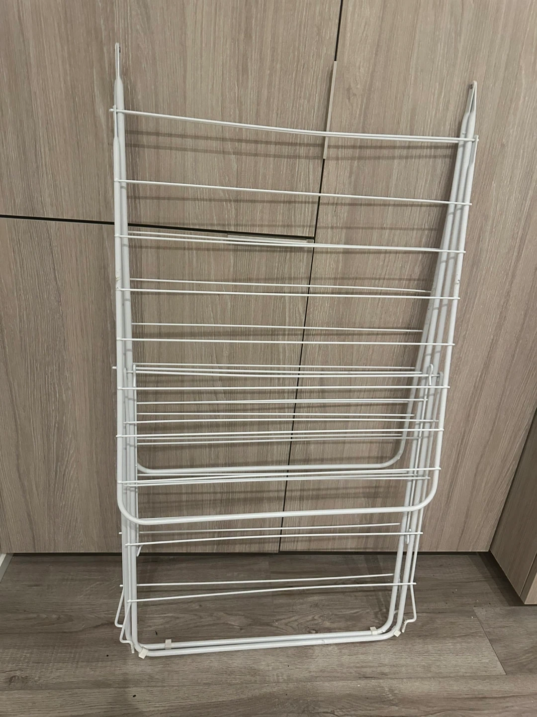Selling a white folding clothes drying rack. It's in great shape and perfect for small spaces. Easy to fold up and store away when not in use. Great for air-drying clothes!