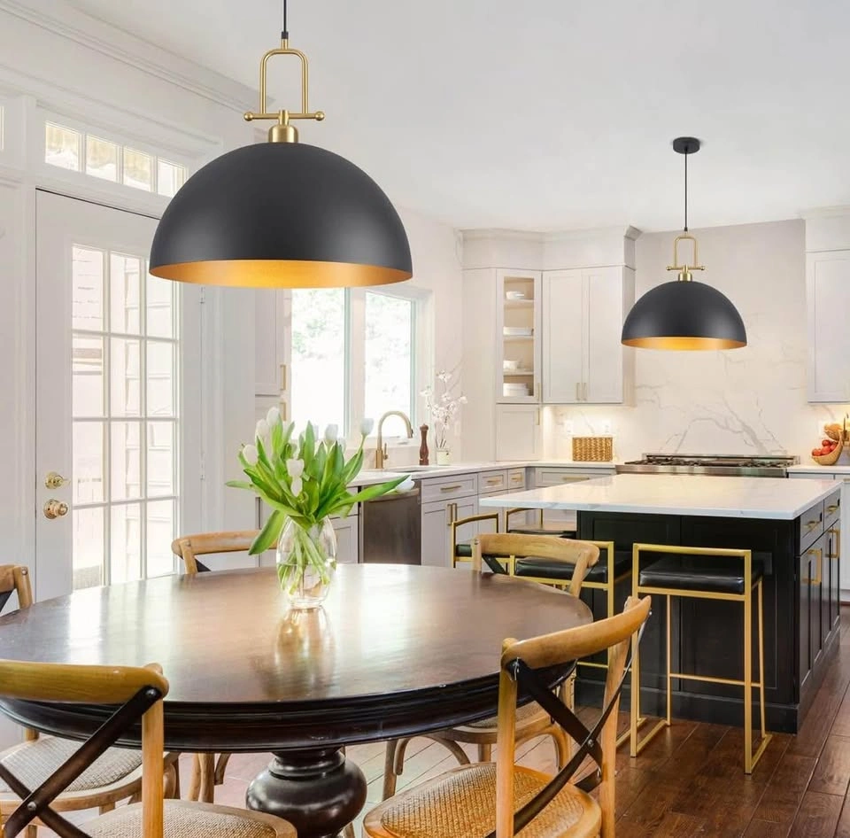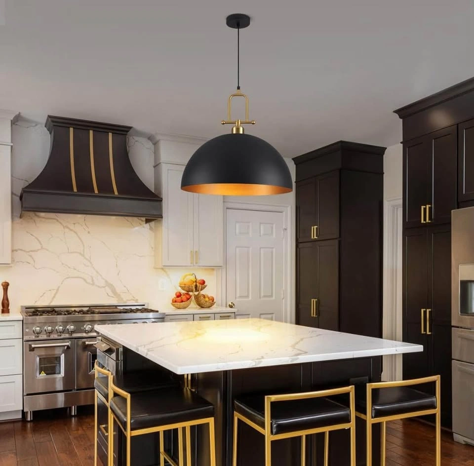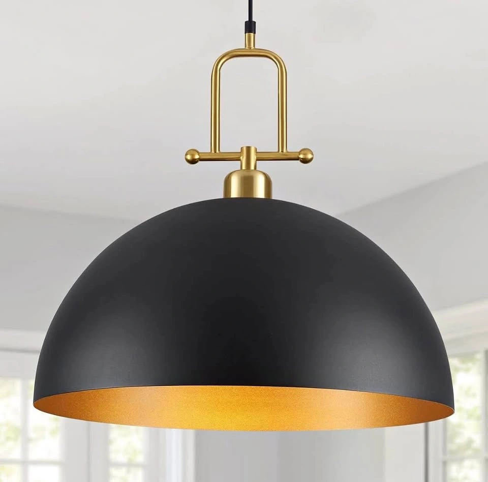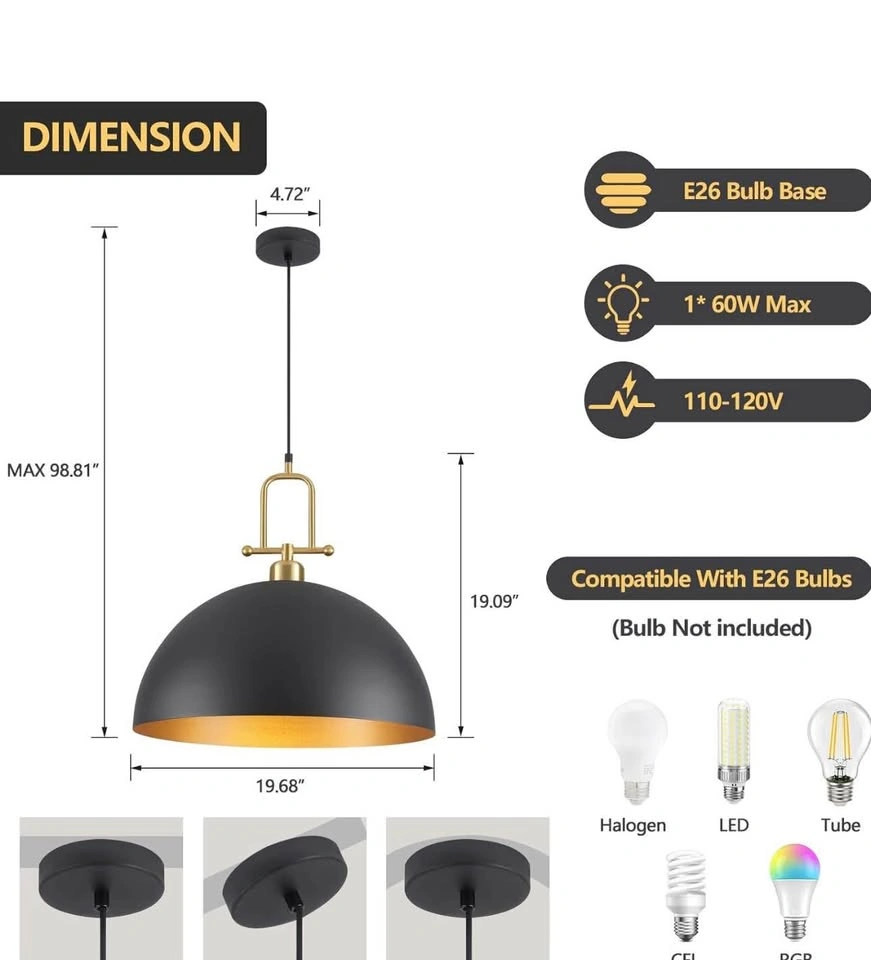 223New 19.7" Dome Pendant Lighting Fixture in Black/Gold. Estimated MSRP: $277. Package Dimensions: 53x53x27cm Modern design, great for kitchen islands, dining areas, entryways, living rooms, bedrooms, bathrooms, hallways, bars, and cafes. Dimensions: 19.7 inches wide, ceiling canopy measures 4.72 inches in diameter. Adjustable metal chain, extending up to a maximum height of 98.81 inches. Adapts to flat, sloped, or vaulted ceilings.